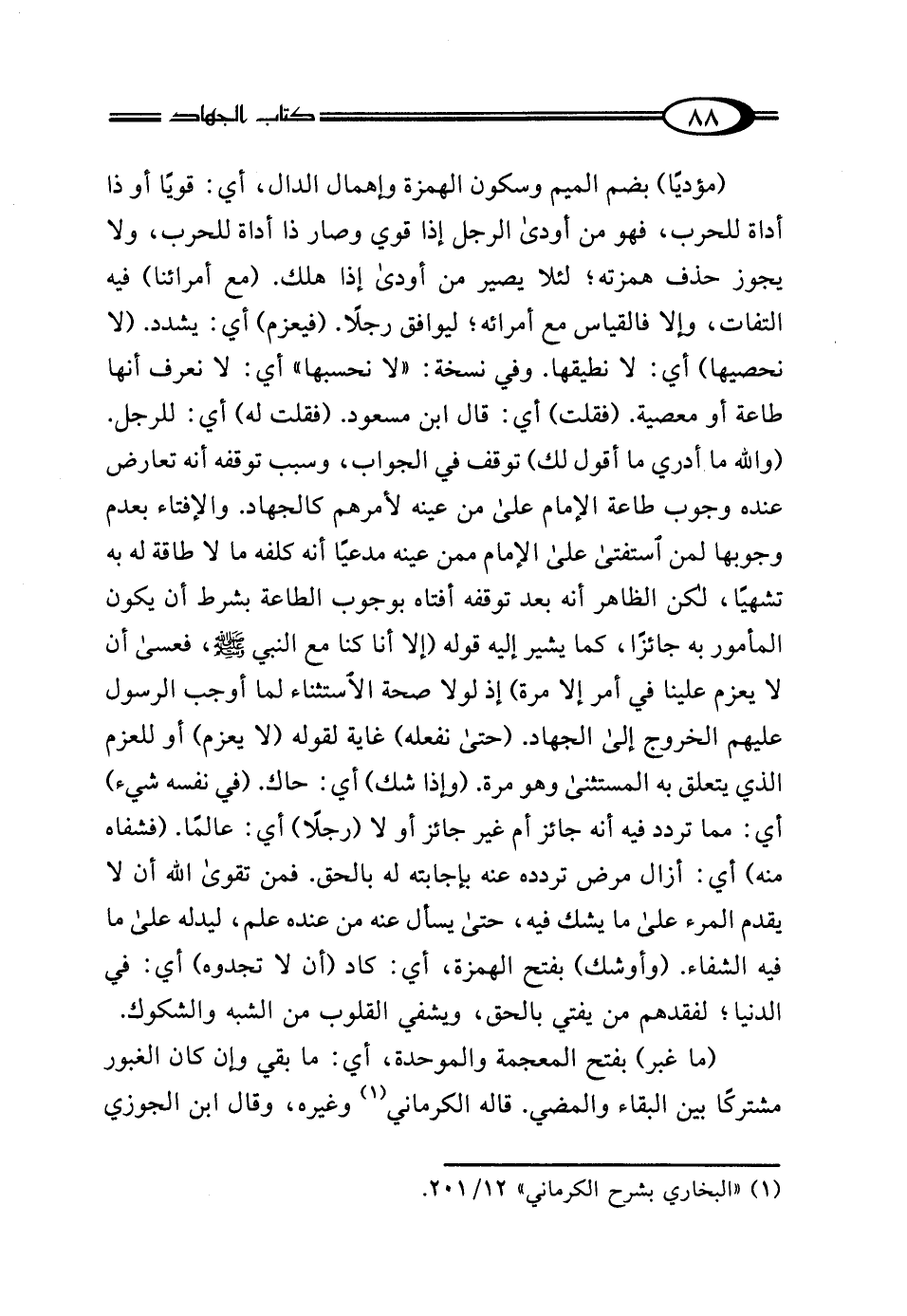 (مؤديًا) بضم الميم وسكون الهمزة وإهمال الدال، أي: قويًّا أو ذا أداة للحرب، فهو من أودى الرجل إذا قوي وصار ذا أداة للحرب، ولا يجوز حذف همزته؛ لئلا يصير من أودى إذا هلك. (مع أمرائنا) فيه التفات، وإلا فالقياس مع أمرائه؛ ليوافق رجلًا. (فيعزم) أي: يشدد. إلا نحصيها) أي: لا نطيقها. وفي نسخة: "لا نحسبها" أي: لا نعرف أنها طاعة أو معصية. (فقلت) أي: قال ابن مسعود. (فقلت له) أي: للرجل. (والله ما أدري ما أقول لك) توقف في الجواب، وسبب توقفه أنه تعارض عنده وجوب طاعة الإمام على من عينه لأمرهم كالجهاد. والإفتاء بعدم وجوبها لمن استفتى على الإمام ممن عينه مدعيًا أنه كلفه ما لا طاقة له به تشهيًا، لكن الظاهر أنه بعد توقفه أفتاه بوجوب الطاعة بشرط أن يكون المأمور به جائزًا، كما يشير إليه قوله (إلا أنا كنا مع النبي - صلى الله عليه وسلم -، فعسى أن لا يعزم علينا في أمر إلا مرة) إذ لولا صحة الاستثناء لما أوجب الرسول عليهم الخروج إلى الجهاد. (حتى نفعله) غاية لقوله (لا يعزم) أو للعزم الذي يتعلق به المستثنى وهو مرة. (وإذا شك) أي: حاك. (في نفسه شيء) أي: مما تردد فيه أنه جائز أم غير جائز أو لا (رجلًا) أي: عالمًا. (فشفاه منه) أي: أزال مرض تردده عنه بإجابته له بالحق. فمن تقوى الله أن لا يقدم المرء على ما يشك فيه، حتى يسأل عنه من عنده علم، ليدله على ما فيه الشفاء. (وأوشك) بفتح الهمزة، أي: كاد (أن لا تجدوه) أي: في الدنيا؛ لفقدهم من يفتي بالحق، ويشفي القلوب من الشبه والشكوك.