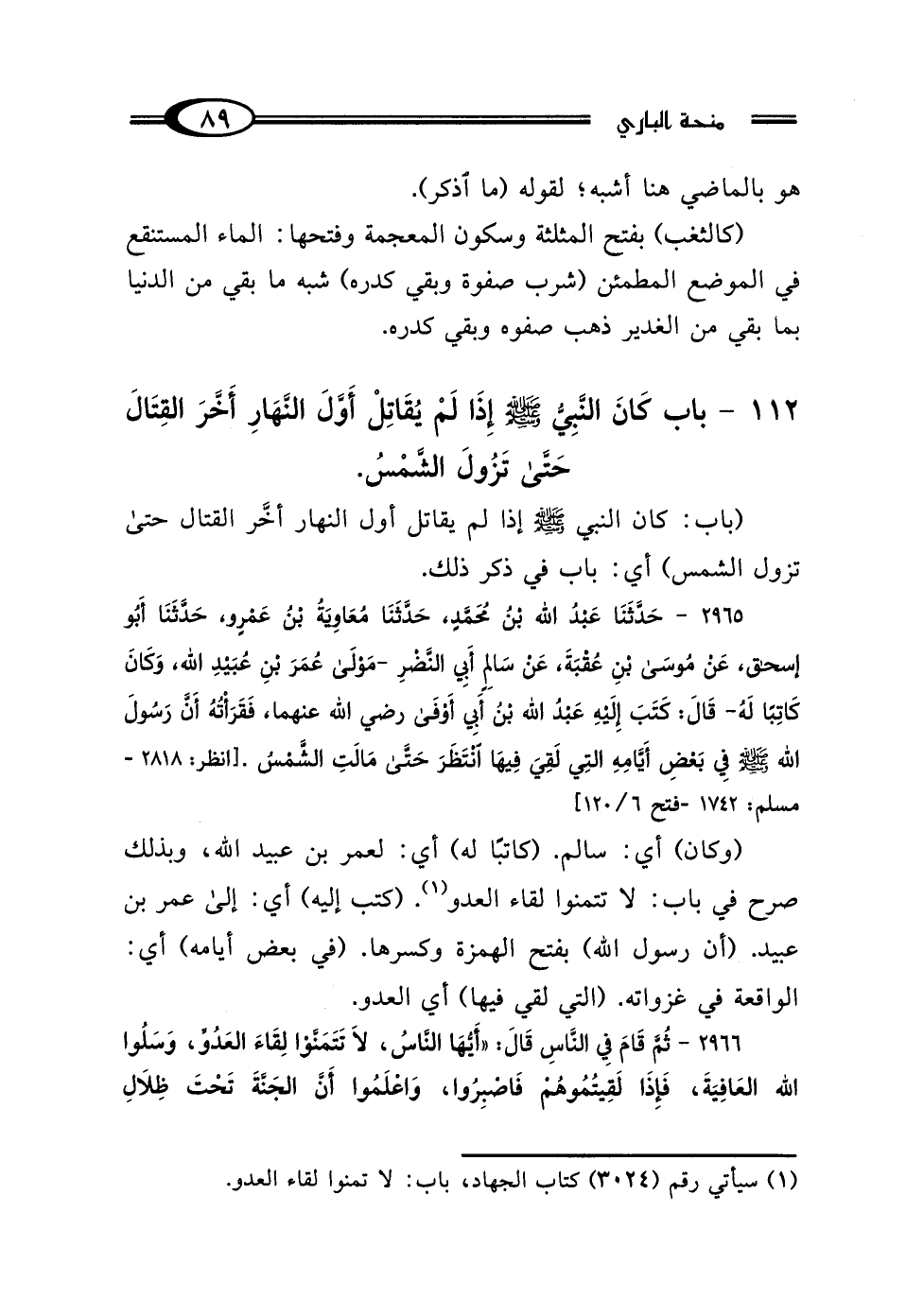 2965 - حَدَّثَنَا عَبْدُ اللَّهِ بْنُ مُحَمَّدٍ، حَدَّثَنَا مُعَاويَةُ بْنُ عَمْرٍو، حَدَّثَنَا أَبُو إِسْحَاقَ، عَنْ مُوسَى بْنِ عُقْبَةَ، عَنْ سَالِمٍ أَبِي النَّضْرِ، مَوْلَى عُمَرَ بْنِ عُبَيْدِ اللَّهِ، وَكَانَ كَاتِبًا لَهُ، قَال: كَتَبَ إِلَيْهِ عَبْدُ اللَّهِ بْنُ أَبِي أَوْفَى رَضِيَ اللَّهُ عَنْهُمَا، فَقَرَأْتُهُ: إِنَّ رَسُولَ اللَّهِ صَلَّى اللهُ عَلَيْهِ وَسَلَّمَ فِي بَعْضِ أَيَّامِهِ الَّتِي لَقِيَ فِيهَا، انْتَظَرَ حَتَّى مَالتِ الشَّمْسُ.