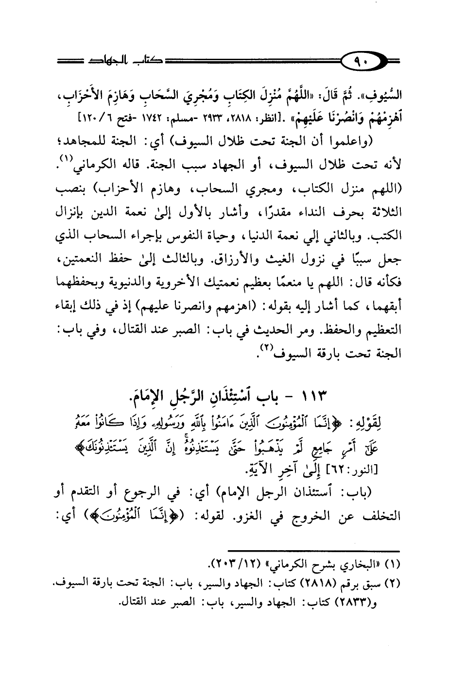 (واعلموا أن الجنة تحت ظلال السيوف) أي: الجنة للمجاهد؛ لأنه تحت ظلال السيوف، أو الجهاد سبب الجنة. قاله الكرماني (¬1). (اللهم منزل الكتاب، ومجري السحاب، وهازم الأحزاب) بنصب الثلاثة بحرف النداء مقدرًا، وأشار بالأول إلى نعمة الدين بإنزال الكتب. وبالثاني إلى نعمة الدنيا، وحياة النفوس بإجراء السحاب الذي جعل سببًا في نزول الغيث والأرزاق. وبالثالث إلى حفظ النعمتين، فكأنه قال: اللهم يا منعمًا بعظيم نعمتيك الأخروية والدنيوية وبحفظهما أبقهما، كما أشار إليه بقوله: (اهزمهم وانصرنا عليهم) إذ في ذلك إبقاء التعظيم والحفظ. ومر الحديث في باب: الصبر عند القتال، وفي باب: الجنة تحت بارقة السيوف (¬2).