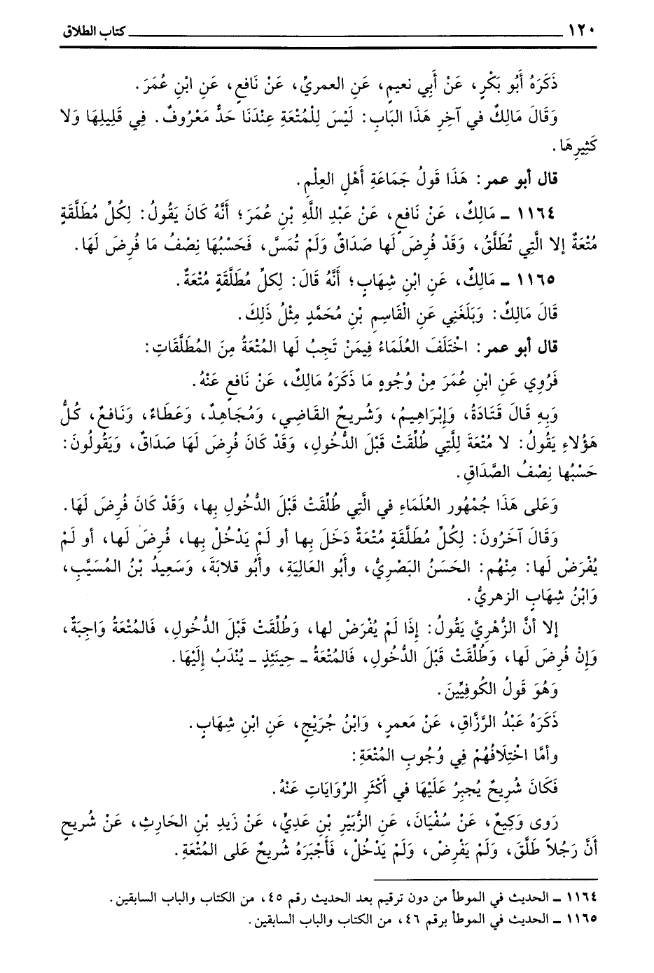 قَالَ أَبُو عُمَرَ لَمْ يَخْتَلِفِ الْعُلَمَاءُ أَنَّ الْمُتْعَةَ الَّتِي ذَكَرَ اللَّهُ - عَزَّ وجل - في كتابه بقوله تعالى (وللمطلقت متع بِالْمَعْرُوفِ) الْبَقَرَةِ 241 وَقَوْلِهِ عَزَّ وَجَلَّ (وَمَتِّعُوهُنَّ عَلَى الْمُوسِعِ قَدَرُهُ وَعَلَى الْمُقْتِرِ قَدَرُهُ) الْبَقَرَةِ 236 أَنَّهَا غير مقدرة ولا محدودة ولا مَعْلُومٍ مَبْلَغُهَا وَلَا مَعْرُوفٍ قَدْرُهَا مَعْرِفَةَ وُجُوبٍ لا يَتَجَاوَزُهُ بَلْ هِيَ عَلَى الْمُوسِعِ بِقَدْرِهِ وَعَلَى الْمُقْتِرِ أَيْضًا بِقَدْرِهِ مَتَاعًا بِالْمَعْرُوفِ كَمَا قَالَ اللَّهُ عَزَّ وَجَلَّ