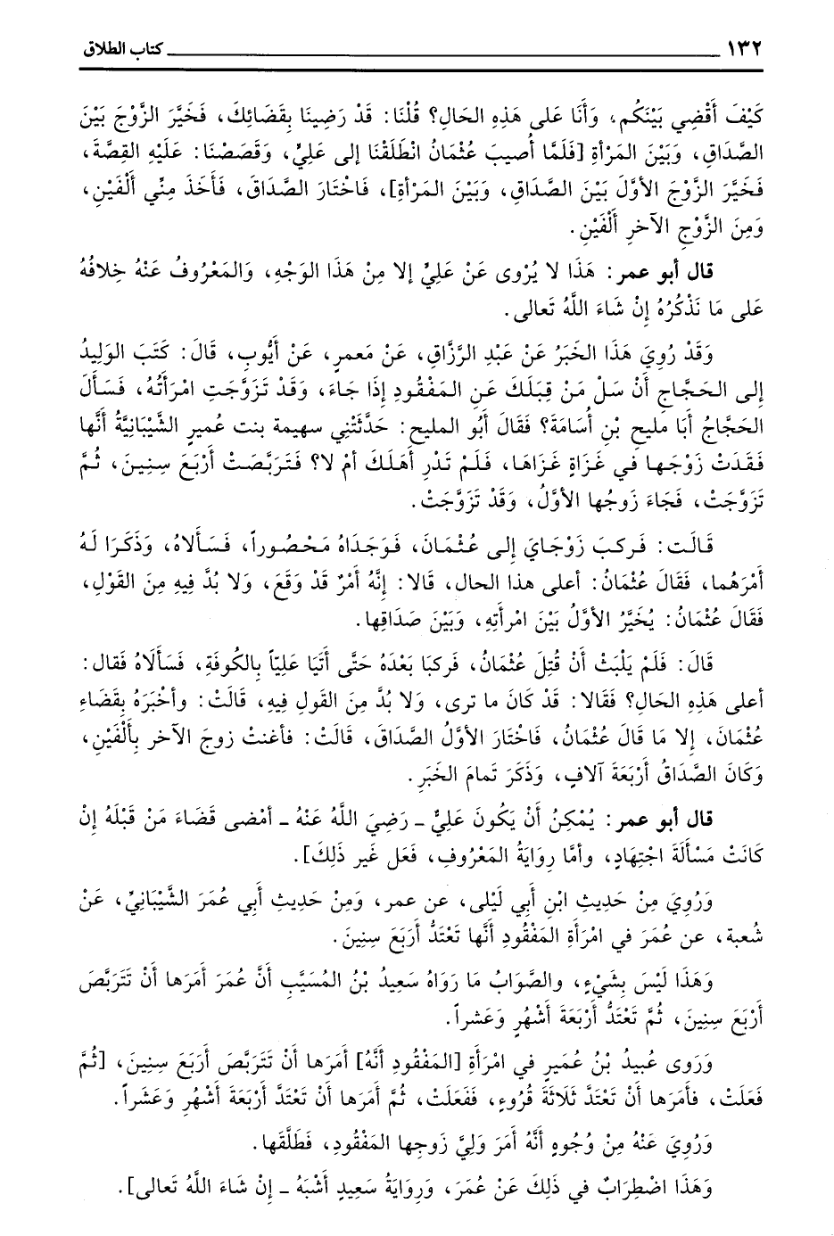 قَالَ أَبُو عُمَرَ رُوِيَ عَنْ عُمَرَ وَعُثْمَانَ فِي الْمَفْقُودِ أَنَّ زَوْجَتَهُ تَتَرَبَّصُ أَرْبَعَ سِنِينَ بَعْدَ شَكْوَاهَا إِلَى السُّلْطَانِ ثُمَّ تَعْتَدُّ أَرْبَعَةَ أَشْهُرٍ وَعَشْرًا ثُمَّ تَنْكِحُ إِنْ شَاءَتْ