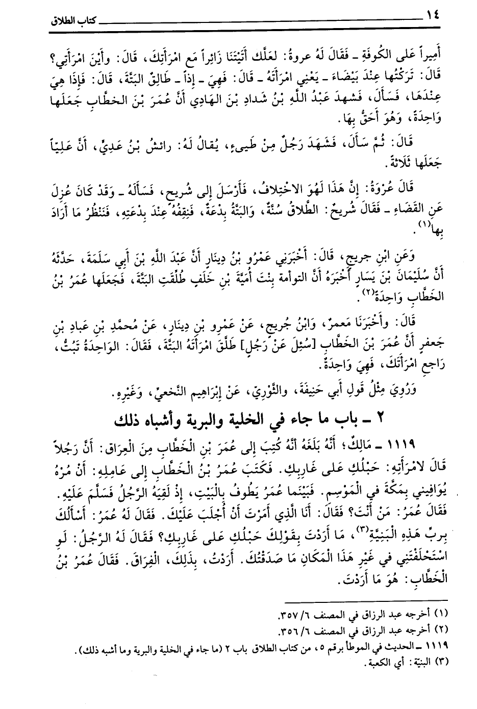 1119 - مَالِكٌ أَنَّهُ بَلَغَهُ أَنَّهُ كُتِبَ إِلَى عُمَرَ بْنِ الْخَطَّابِ مِنَ الْعِرَاقِ أَنَّ رَجُلًا قَالَ لِامْرَأَتِهِ حَبْلُكِ عَلَى غَارِبِكِ فَكَتَبَ عُمَرُ بْنُ الْخَطَّابِ إِلَى عَامِلِهِ أَنْ مُرْهُ يُوَافِينِي بِمَكَّةَ فِي الْمَوْسِمِ فَبَيْنَمَا عُمَرُ يَطُوفُ بِالْبَيْتِ إِذْ لَقِيَهُ الرَّجُلُ فَسَلَّمَ عَلَيْهِ فَقَالَ عُمَرُ مَنْ أَنْتَ فَقَالَ أَنَا الَّذِي أَمَرْتَ أَنْ أُجْلَبَ عَلَيْكَ فَقَالَ لَهُ عُمَرُ أَسْأَلُكَ بِرَبِّ هَذِهِ الْبَنِيَّةِ مَا أَرَدْتَ بِقَوْلِكَ حَبْلُكِ عَلَى غَارِبِكِ فَقَالَ لَهُ الرَّجُلُ لَوِ اسْتَحْلَفْتَنِي فِي غَيْرِ هَذَا الْمَكَانِ مَا صَدَقْتُكَ أَرَدْتُ بِذَلِكَ الْفِرَاقَ فَقَالَ عُمَرُ بْنُ الْخَطَّابِ هُوَ مَا أَرَدْتَ