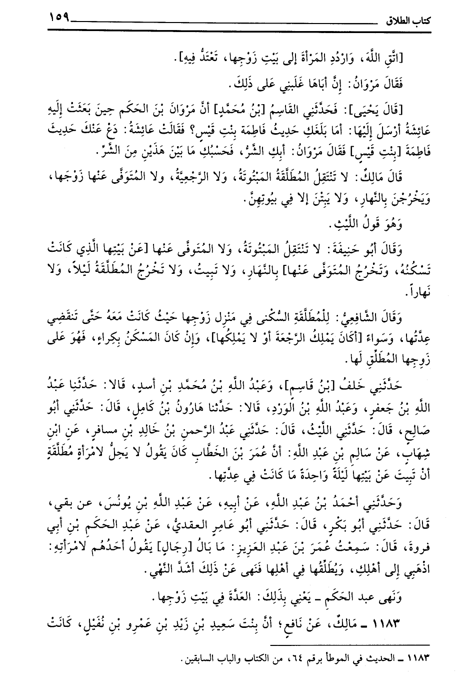 1182 - مَالِكٌ عَنْ يَحْيَى بْنِ سَعِيدٍ عَنْ الْقَاسِمِ بْنِ مُحَمَّدٍ وَسُلَيْمَانَ بْنِ يَسَارٍ أَنَّهُ سَمِعَهُمَا يَذْكُرَانِ أَنَّ يَحْيَى بْنَ سَعِيدِ بْنِ الْعَاصِ طَلَّقَ ابْنَةَ عَبْدِ الرَّحْمَنِ بْنِ الْحَكَمِ الْبَتَّةَ فَانْتَقَلَهَا عَبْدُ الرَّحْمَنِ بْنُ الْحَكَمِ فَأَرْسَلَتْ عَائِشَةُ أُمُّ الْمُؤْمِنِينَ إِلَى مَرْوَانَ بْنِ الْحَكَمِ وَهُوَ يَوْمَئِذٍ أَمِيرُ الْمَدِينَةِ فَقَالَتْ اتَّقِ اللَّهَ وَارْدُدِ الْمَرْأَةَ إِلَى بَيْتِهَا فَقَالَ مَرْوَانُ فِي حَدِيثِ سُلَيْمَانَ إِنَّ عَبْدَ الرَّحْمَنِ غَلَبَنِي وَقَالَ مَرْوَانُ في حديث القاسم أو ما بَلَغَكَ شَأْنُ فَاطِمَةَ بِنْتِ قَيْسٍ فَقَالَتْ عَائِشَةُ لَا يَضُرُّكَ أَنْ لَا تَذْكُرَ حَدِيثَ فَاطِمَةَ فَقَالَ مَرْوَانُ إِنْ كَانَ بِكِ الشَّرُّ فَحَسْبُكِ مَا بَيْنَ هَذَيْنِ مِنَ الشَّرِّ