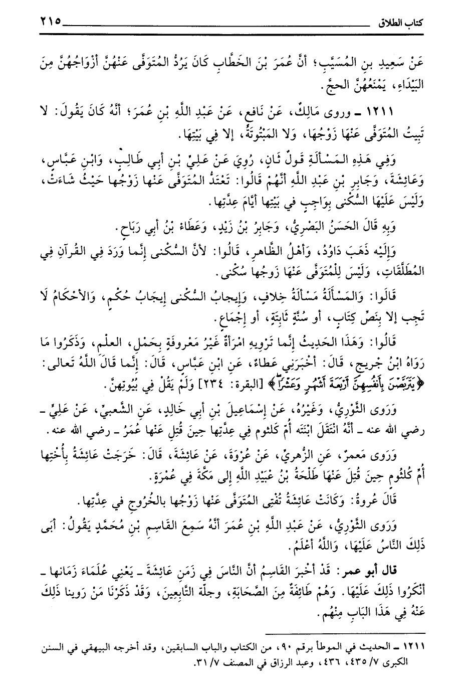1209 - مَالِكٌ عَنْ سَعِيدِ بْنِ إِسْحَاقَ بْنِ كَعْبِ بْنِ عُجْرَةَ عَنْ عَمَّتِهِ زَيْنَبَ بِنْتِ كَعْبِ بْنِ عُجْرَةَ أَنَّ الْفُرَيْعَةَ بِنْتَ مَالِكِ بْنِ سِنَانٍ وَهِيَ أُخْتُ أَبِي سَعِيدٍ الْخُدْرِيِّ أَخْبَرَتْهَا أَنَّهَا جَاءَتْ إِلَى رَسُولِ اللَّهِ صَلَّى اللَّهُ عَلَيْهِ وَسَلَّمَ تَسْأَلُهُ أَنْ تَرْجِعَ إِلَى أَهْلِهَا فِي بَنِي خُدْرَةَ فَإِنَّ زَوْجَهَا خَرَجَ فِي طَلَبِ أَعْبُدٍ لَهُ أَبَقُوا حَتَّى إِذَا كَانُوا بِطَرَفٍ الْقَدُومِ لَحِقَهُمْ فَقَتَلُوهُ قَالَتْ فَسَأَلْتُ رَسُولَ اللَّهِ صَلَّى اللَّهُ عَلَيْهِ وَسَلَّمَ أَنْ أَرْجِعَ إِلَى أهلي في بني خدرة فإنه