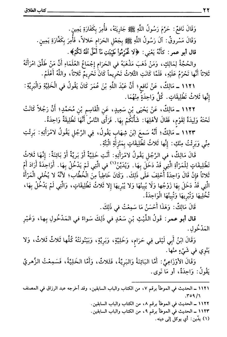 1121 - مَالِكٌ عَنْ نَافِعٍ أَنَّ عَبْدَ اللَّهِ بْنَ عُمَرَ كَانَ يَقُولُ فِي الْخَلِيَّةِ وَالْبَرِيَّةِ إِنَّهَا ثَلَاثُ تَطْلِيقَاتٍ كُلُّ وَاحِدَةٍ مِنْهُمَا