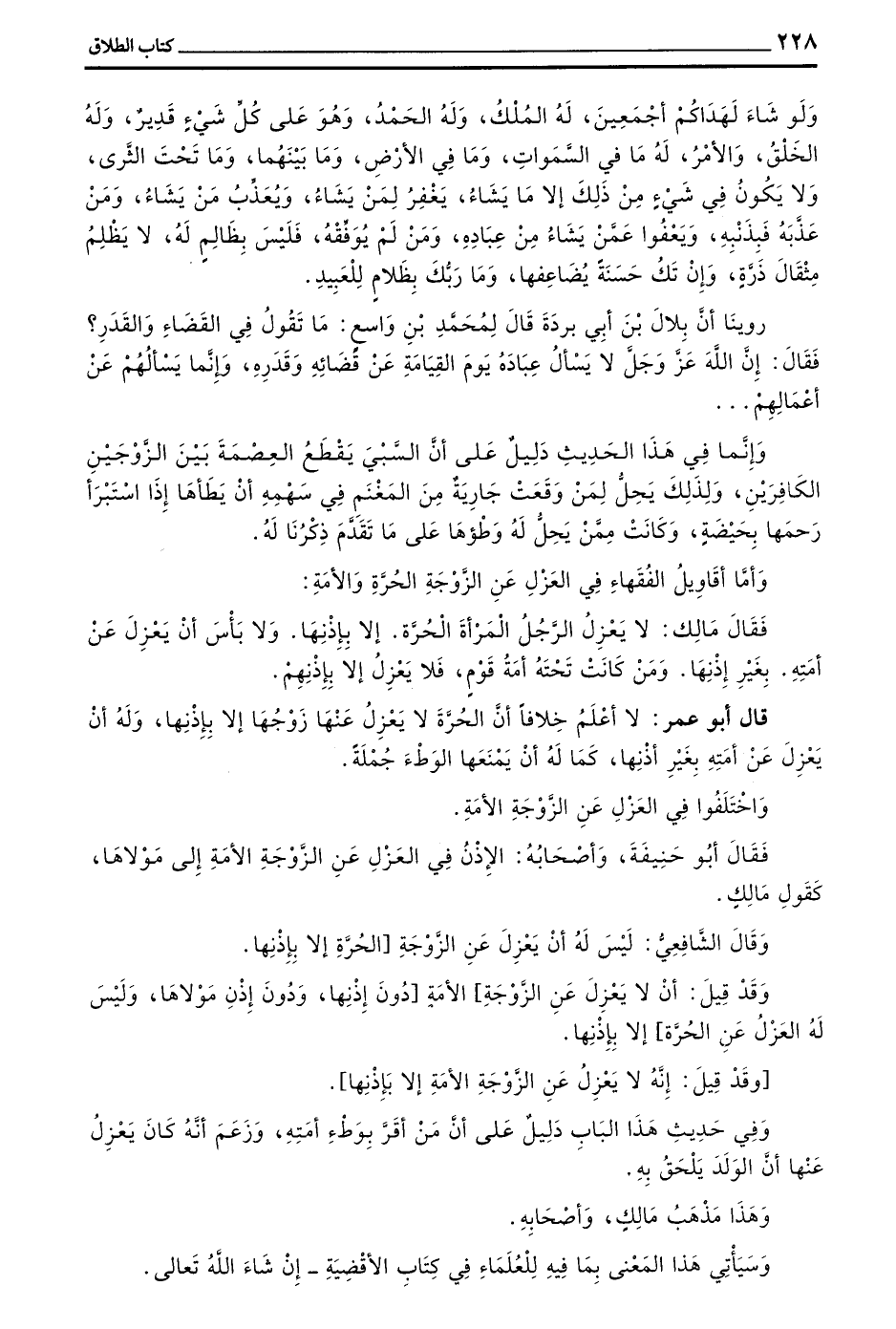وروى بْنُ عُيَيْنَةَ عَنْ يَحْيَى بْنِ سَعِيدٍ عَنْ سَعِيدِ بْنِ الْمُسَيِّبِ أَنَّهُ سُئِلَ عَنِ الْعَزْلِ فَقَالَ اخْتَلَفَ فِيهِ أَصْحَابُ مُحَمَّدٍ صَلَّى اللَّهُ عَلَيْهِ وَسَلَّمَ إِنَّمَا هُوَ حَرْثُكَ إِنْ شِئْتَ أَعْطَشْتَهُ وَإِنْ شِئْتَ سَقَيْتَهُ