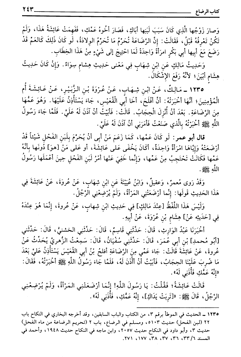 1233 - مَالِكٌ عَنْ عَبْدِ اللَّهِ بْنِ أَبِي بَكْرٍ عَنْ عَمْرَةَ بِنْتِ عَبْدِ الرَّحْمَنِ أَنَّ عَائِشَةَ أُمَّ الْمُؤْمِنِينَ أَخْبَرَتْهَا أَنَّ رَسُولَ اللَّهِ صَلَّى اللَّهُ عَلَيْهِ وَسَلَّمَ كَانَ عِنْدَنَا وَأَنَّهَا سَمِعَتْ صَوْتَ رَجُلٍ يَسْتَأْذِنُ فِي بَيْتِ حَفْصَةَ قَالَتْ عَائِشَةُ فَقُلْتُ يَا رَسُولَ اللَّهِ هَذَا رَجُلٌ يَسْتَأْذِنُ فِي بَيْتِكَ فَقَالَ رَسُولُ اللَّهِ صَلَّى اللَّهُ عَلَيْهِ وَسَلَّمَ ((أُرَاهُ فُلَانًا)) لِعَمٍّ لِحَفْصَةَ مِنَ الرَّضَاعَةِ فَقَالَتْ عَائِشَةُ يَا رَسُولَ اللَّهِ لَوْ كَانَ فُلَانٌ حَيًّا لِعَمِّهَا مِنَ الرَّضَاعَةِ دَخَلَ عَلَيَّ فَقَالَ رَسُولُ اللَّهِ صَلَّى اللَّهُ عَلَيْهِ وَسَلَّمَ ((نَعَمْ إِنَّ الرَّضَاعَةَ تُحَرِّمُ مَا تُحَرِّمُ الْوِلَادَةُ))