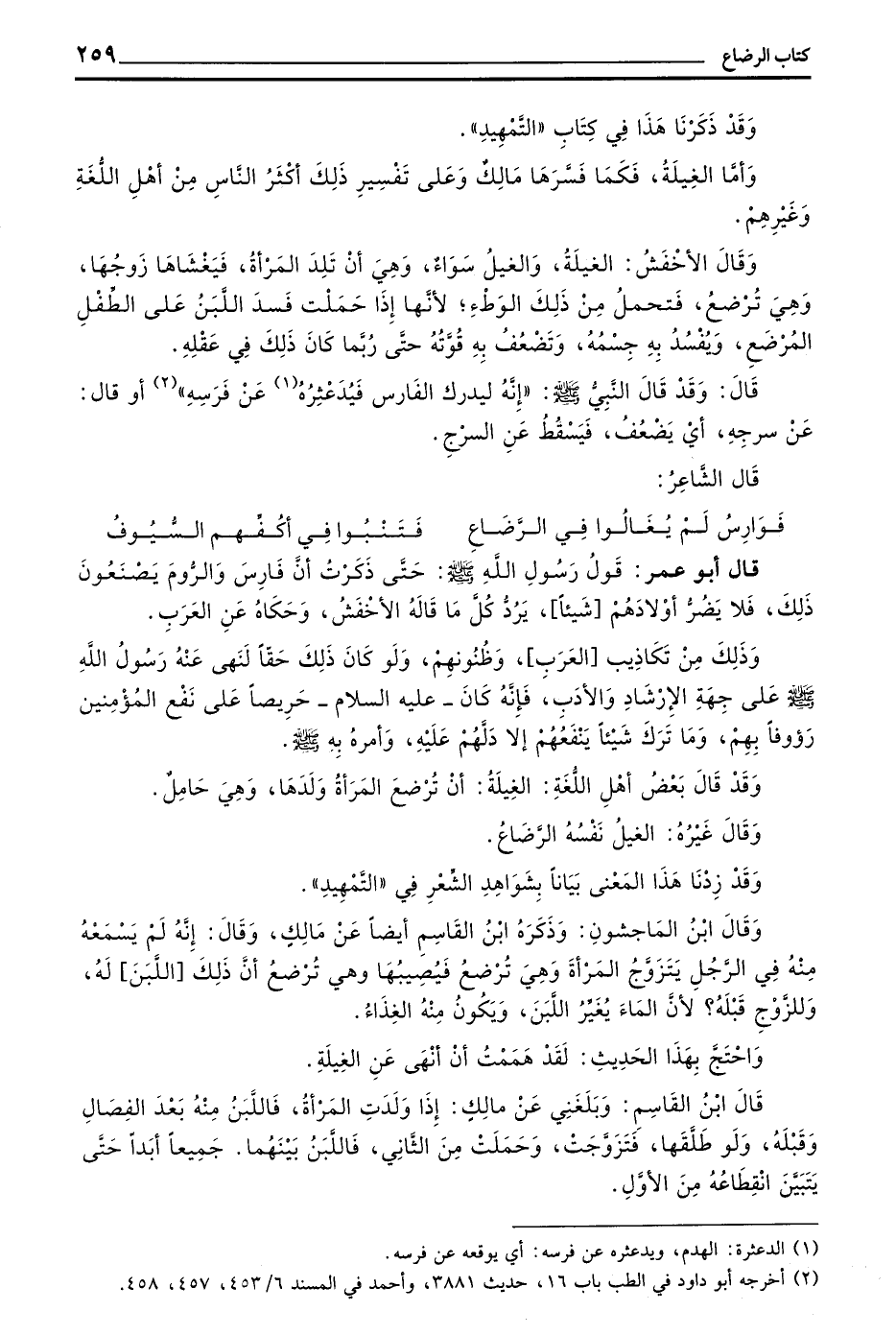 مَا رواه بن عُيَيْنَةَ وَغَيْرُهُ عَنْ إِسْمَاعِيلَ بْنِ أَبِي خَالِدٍ عَنْ أَبِي عَمْرٍو الشَّيْبَانِيِّ أَنَّ رَجُلًا كَانَتْ له امرأة فولدت غلام فَجَرَى لَبَنُهَا فَأَمَرَتْ زَوْجَهَا أَنْ يَمُصَّ عَنْهَا فَجَعَلَ يَمُصُّهُ وَيَمُجُّهُ فَرَأَى أَنَّهُ سَبَقَهُ مِنْهُ شَيْءٌ فَدَخَلَ فِي بَطْنِهِ فَأَتَى أَبَا مُوسَى الْأَشْعَرِيَّ فَسَأَلَهُ عَنْ ذَلِكَ فَكَرِهَهَا لَهُ وَقَالَ ائْتِ عَبْدَ اللَّهِ بْنَ مَسْعُودٍ فَإِنَّهُ أَعْلَمُ بذلك فأتاه فأخبره بقول أبي مَسْعُودٍ فَإِنَّهُ أَعْلَمُ بِذَلِكَ فَأَتَاهُ فَأَخْبَرَهُ بِقَوْلِ أبي موسى فقال بن مَسْعُودٍ إِنَّهَا لَمْ تُحَرِّمْ عَلَيْكَ امْرَأَتَكَ فَقَالَ أَبُو مُوسَى يَا أَهْلَ الْكُوفَةِ! لَا تَسْأَلُونِي عَنْ شَيْءٍ مَا دَامَ هَذَا الْحَبْرُ بَيْنَ أظهركم يعني بن مَسْعُودٍ