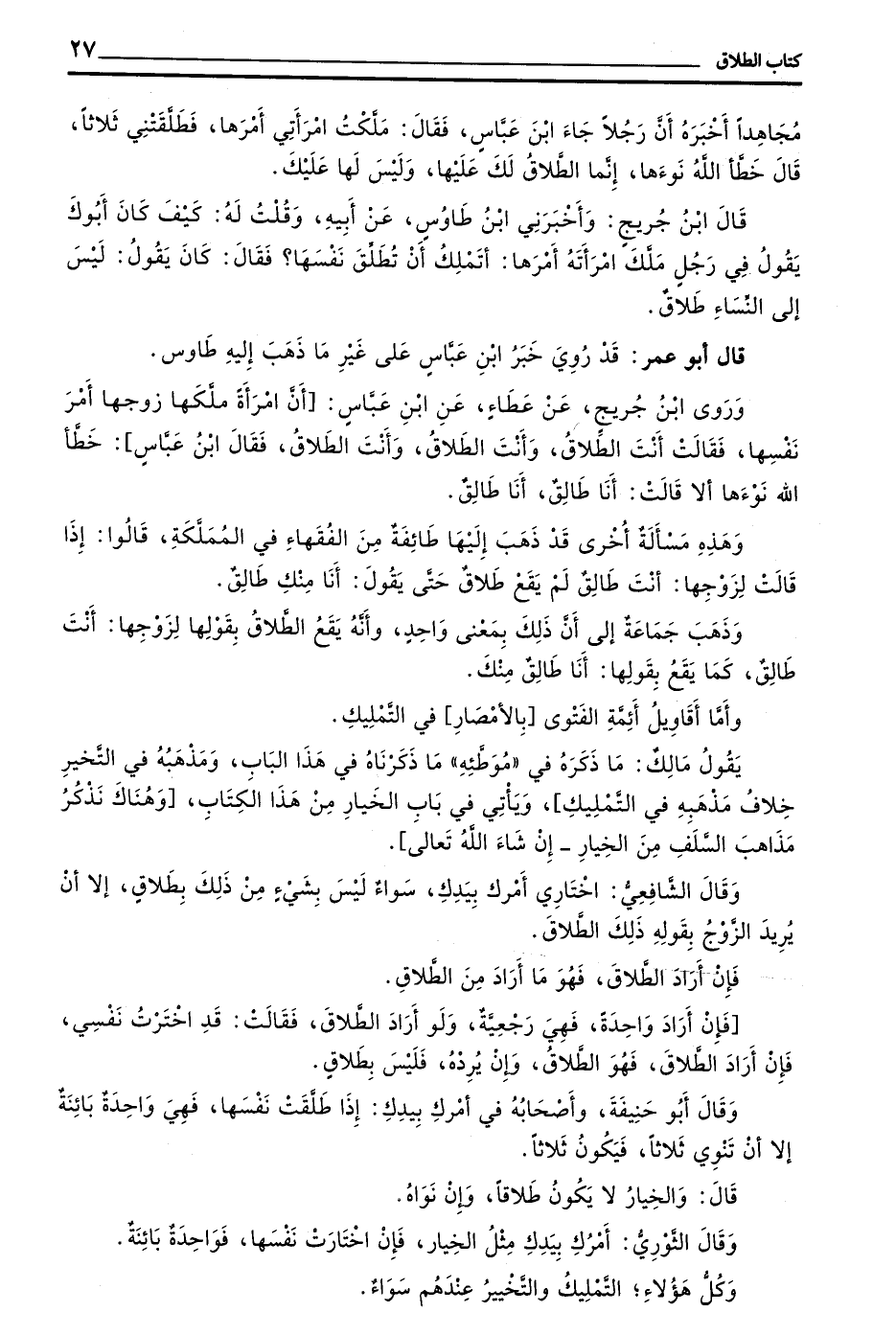مجاهدا أخبره أن رجلا جاء بن عَبَّاسٍ فَقَالَ مَلَّكْتُ امْرَأَتِي أَمْرَهَا فَطَلَّقَتْنِي ثَلَاثًا قَالَ خَطَّأَ اللَّهُ نَوْءَهَا إِنَّمَا الطَّلَاقُ لَكَ عليها وليس لها عليك