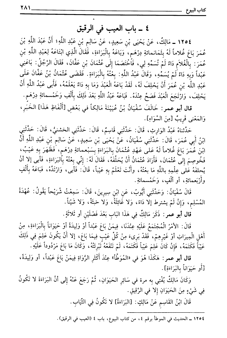 قال بن وهب وأخبرنا بن سَمْعَانَ قَالَ سَمِعْتُ رِجَالًا مِنْ عُلَمَائِنَا مِنْهُمْ يَحْيَى بْنُ سَعِيدٍ الْأَنْصَارِيُّ يَقُولُونَ لَمْ تَزَلِ الْوُلَاةُ بِالْمَدِينَةِ فِي الزَّمَنِ الْأَوَّلِ يَقْضُونَ فِي الرَّقِيقِ بِعُهْدَةِ السَّنَةِ فِي الْجُذَامِ وَالْجُنُونِ وَالْبَرَصِ إِنْ ظَهَرَ بِالْمَمْلُوكِ شَيْءٌ مِنْ ذَلِكَ قَبْلَ أَنْ يَحُولَ الْحَوْلُ عَلَيْهِ فَهُوَ رَادٌّ عَلَى الْبَائِعِ وَيَقْضُونَ فِي عُهْدَةِ الرَّقِيقِ بِثَلَاثِ لَيَالٍ فَإِنْ حَدَثَ فِي الرَّأْسِ فِي تِلْكَ اللَّيَالِي الثلاث جدت من موت أو بعض فهو من البائع وَإِنَّمَا كَانَتْ عُهْدَةُ الثَّلَاثِ مِنْ أَجْلِ حُمَّى الربع لأنها لا يتبين إِلَّا فِي ثَلَاثِ لَيَالٍ