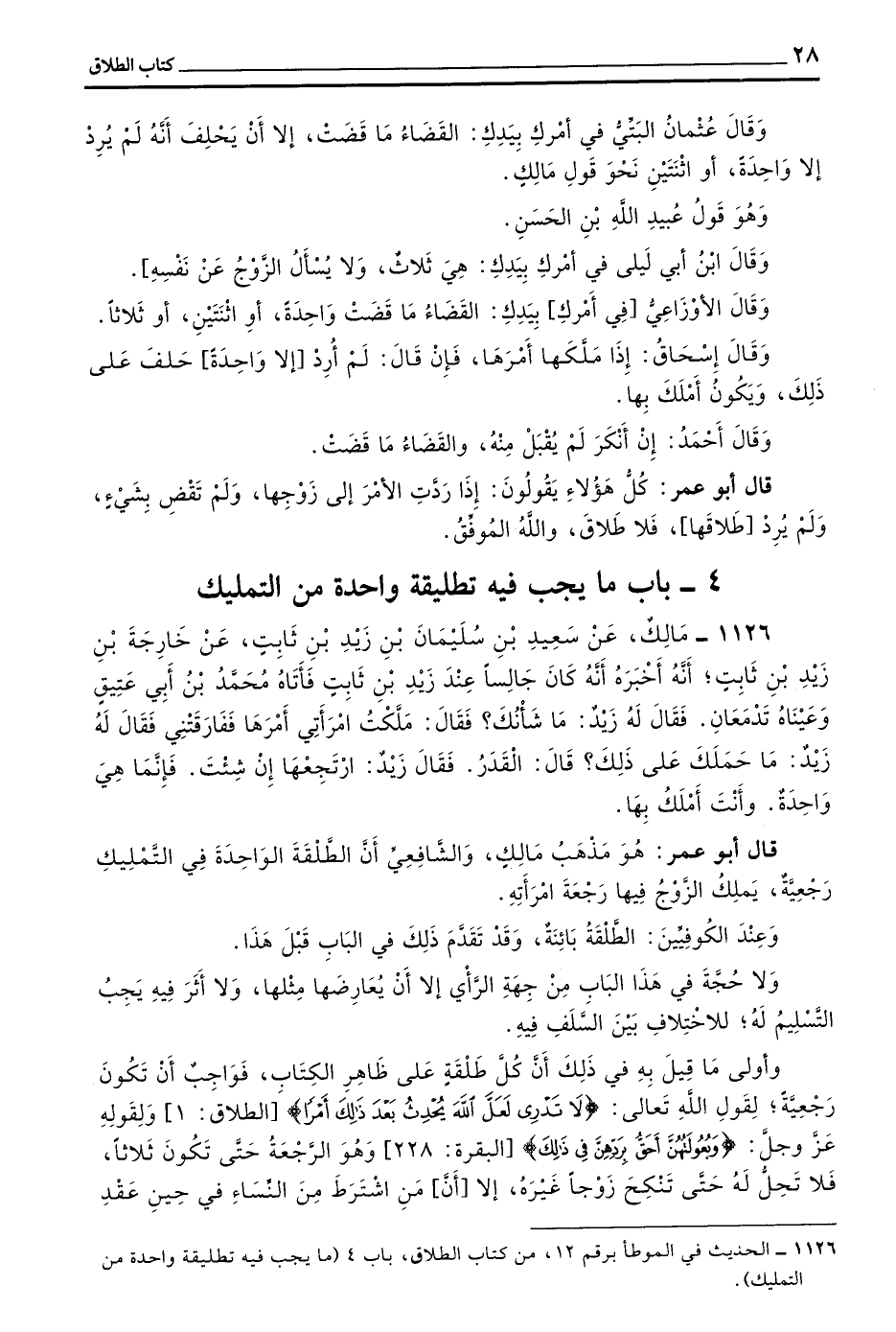 1126 - مَالِكٌ عَنْ سَعِيدِ بْنِ سُلَيْمَانَ بْنِ زَيْدِ بْنِ ثَابِتٍ عَنْ خَارِجَةَ بْنِ زَيْدِ بْنِ ثَابِتٍ أَنَّهُ أَخْبَرَهُ أَنَّهُ كَانَ جَالِسًا عِنْدَ زَيْدِ بْنِ ثَابِتٍ فَأَتَاهُ مُحَمَّدُ بْنُ أَبِي عَتِيقٍ وَعَيْنَاهُ تَدْمَعَانِ فَقَالَ لَهُ زَيْدٌ مَا شَأْنُكَ فقال مَلَّكْتُ امْرَأَتِي أَمْرَهَا فَفَارَقَتْنِي فَقَالَ لَهُ زَيْدٌ مَا حَمَلَكَ عَلَى ذَلِكَ قَالَ الْقَدْرُ فَقَالَ زَيْدٌ ارْتَجِعْهَا إِنْ شِئْتَ فَإِنَّمَا هِيَ وَاحِدَةٌ وَأَنْتَ أَمَلَكُ بِهَا