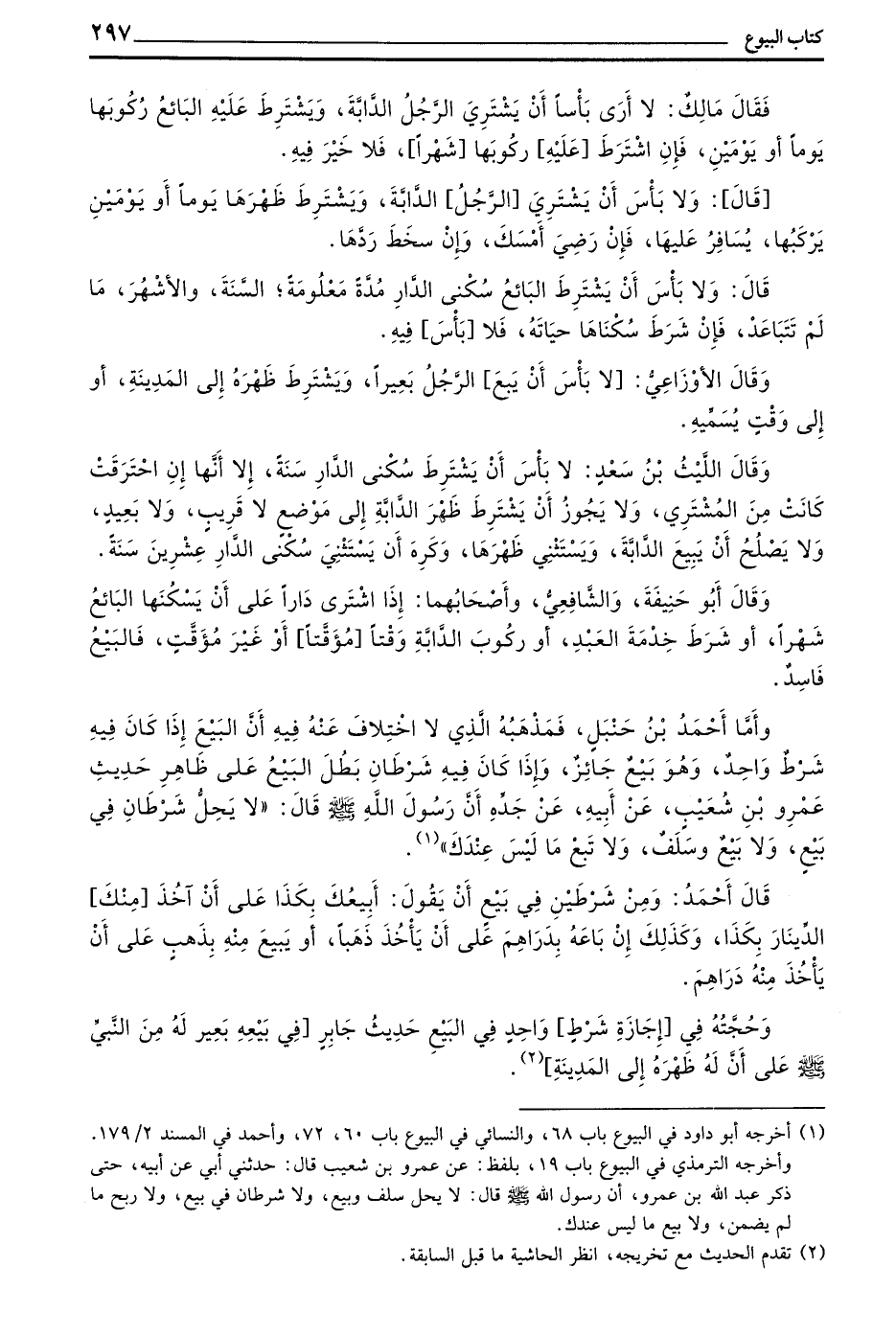 وَقَالَ الشَّافِعِيُّ إِذَا ابْتَاعَ الرَّجُلُ الْعَبْدَ عَلَى أَلَّا يَبِيعَهُ أَوْ عَلَى أَنْ يَبِيعَهُ مِنْ فُلَانٍ أَوْ عَلَى أَلَّا يَسْتَخْدِمَهُ أَوْ عَلَى أَنْ لَا يُعْتِقَهُ أَوْ عَلَى أَنْ يُخَارِجَهُ فَالْبَيْعُ فَاسِدٌ وَلَا يَجُوزُ الشَّرْطُ فِي هَذَا إِلَّا فِي مَوْضِعٍ وَاحِدٍ وَهُوَ الْعِتْقُ اتِّبَاعًا لِلسُّنَّةِ وَلِفِرَاقِ الْعِتْقِ مَا سِوَاهُ فَنَقُولُ إِنِ اشْتَرَاهُ مِنْهُ عَلَى أَنْ يُعْتِقَهُ فَأَعْتَقَهُ فَالْبَيْعُ جَائِزٌ