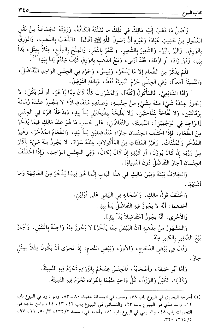 قَالَ مَالِكٌ الْأَمْرُ الْمُجْتَمَعُ عَلَيْهِ عِنْدَنَا أَنَّ مَنِ ابْتَاعَ شَيْئًا مِنَ الْفَاكِهَةِ مِنْ رَطْبِهَا أَوْ يَابِسِهَا فَإِنَّهُ لَا يَبِيعُهُ حَتَّى يَسْتَوْفِيَهُ وَلَا يُبَاعُ شَيْءٌ مِنْهَا بَعْضُهُ بِبَعْضٍ إِلَّا يَدًا بِيَدٍ وما كان منها مِمَّا يَيْبَسُ فَيَصِيرُ فَاكِهَةً يَابِسَةً تُدَّخَرُ وَتُؤْكَلُ فَلَا يُبَاعُ بَعْضُهُ بِبَعْضٍ إِلَّا يَدًا بِيَدٍ وَمِثْلًا بِمِثْلٍ إِذَا كَانَ مِنْ صِنْفٍ وَاحِدٍ فَإِنْ كَانَ مِنْ صِنْفَيْنِ مُخْتَلِفَيْنِ فَلَا