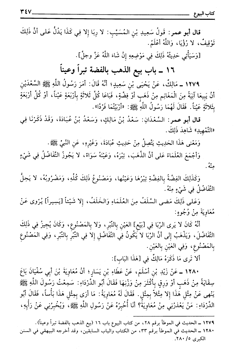 وَأَصْلُ مَا ذَهَبَ إِلَيْهِ مَالِكٌ فِي ذَلِكَ مَا نَقَلَتْهُ الْكَافَّةُ وَرَوَتْهُ الْجَمَاعَةُ مِنْ نَقْلِ الْعُدُولِ مِنْ حَدِيثِ عُبَادَةَ وَغَيْرِهِ أَنَّ رَسُولَ اللَّهِ صَلَّى اللَّهُ عَلَيْهِ وَسَلَّمَ قَالَ ((الذَّهَبُ بالذهب والورق بالورق والبر بالبر والشعير بالشعير وَالتَّمْرُ بِالتَّمْرِ وَالْمِلْحُ بِالْمِلْحِ مِثْلًا بِمِثْلٍ يَدًا بِيَدٍ وَمَنْ زَادَ أَوِ ازْدَادَ فَقَدْ أَرْبَى وَبَيْعُ الذَّهَبِ بِالْوَرِقِ كَيْفَ شِئْتُمْ يَدًا بِيَدٍ))