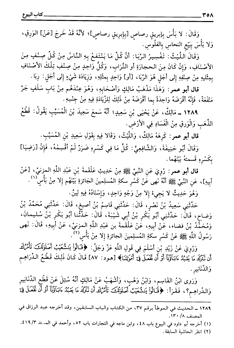 1288 - مَالِكٌ عَنْ أَبِي الزِّنَادِ أَنَّهُ سَمِعَ سَعِيدَ بْنَ الْمُسَيَّبِ يَقُولُ لَا رِبَا إِلَّا فِي ذَهَبٍ أَوْ فِضَّةٍ أَوْ مَا يُكَالُ أَوْ يُوزَنُ بِمَا يُؤْكَلُ أَوْ يُشْرَبُ