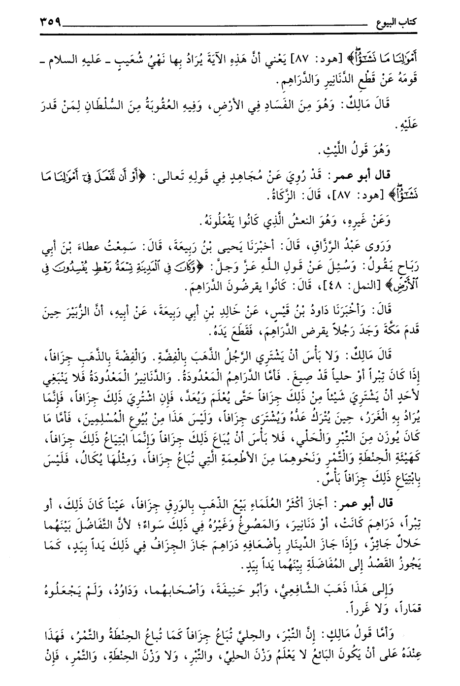 وَأَمَّا دَاوُدُ بْنُ عَلِيٍّ فَلَا رِبَا عِنْدَهُ إِلَّا فِي النَّسِيئَةِ إِلَّا الْأَشْيَاءَ الْمَنْصُوصَةَ فِي الْحَدِيثِ وَهِيَ الذَّهَبُ وَالْوَرِقُ وَالْبُرُّ وَالشَّعِيرُ وَالتَّمْرُ وَالْبَلَحُ لَا يَجُوزُ فِي الْجِنْسِ الْوَاحِدِ مِنْهَا عِنْدَهُ التَّفَاضُلُ دُونَ النَّسِيئَةِ وَمَا عَدَاهَا مِنْ كُلِّ شَيْءٍ يُكَالُ أَوْ يُوزَنُ أَوْ يُؤْكَلُ أَوْ يُشْرَبُ أَوْ لَا يُكَالُ وَلَا يُوزَنُ وَلَا يُؤْكَلُ وَلَا يُشْرَبُ لَا يَدْخُلُهُ الرِّبَا بِوَجْهٍ مِنَ الْوُجُوهِ وَجَائِزٌ بَيْعُ ذَلِكَ كُلِّهِ عِنْدَهُ كَيْفَ شَاءَ الْمُتَبَايِعُونَ عَلَى عُمُومِ قَوْلِ اللَّهِ عَزَّ وَجَلَّ (وَأَحَلَّ اللَّهُ الْبَيْعَ وحرم الربوا) الْبَقَرَةِ 275 ثُمَّ بَيَّنَ رَسُولُ اللَّهِ صَلَّى اللَّهُ عَلَيْهِ وَسَلَّمَ الرِّبَا فِي حَدِيثِ عُمَرَ بْنِ الْخَطَّابِ وَيَأْتِي ذِكْرُهُ فِي بَابِ الصَّرْفِ إِنْ شَاءَ اللَّهُ تَعَالَى وَفِي حَدِيثِ عُبَادَةَ وَقَدْ تَقَدَّمَ