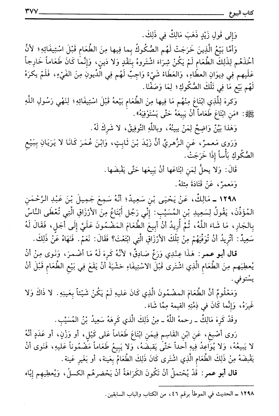 1295 - مَالِكٌ عَنْ نَافِعٍ أَنَّ حَكِيمَ بْنَ حِزَامٍ ابْتَاعَ طَعَامًا أَمَرَ بِهِ عُمَرُ بْنُ الْخَطَّابِ لِلنَّاسِ فَبَاعَ حَكِيمٌ الطَّعَامَ قَبْلَ أَنْ يَسْتَوْفِيَهُ فَبَلَغَ ذَلِكَ عُمَرَ بْنَ الْخَطَّابِ فَرَدَّهُ عَلَيْهِ وَقَالَ لَا تَبِعْ طَعَامًا ابْتَعْتَهُ حَتَّى تَسْتَوْفِيَهُ