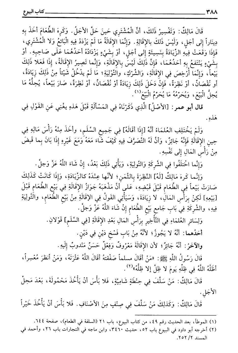 قَالَ أَبُو عُمَرَ اخْتَلَفَ الْفُقَهَاءُ فِي الشِّرَاءِ بِرَأْسِ مَالِ الْمُسَلِّمِ مِنَ الْمُسَلَّمِ إِلَيْهِ شَيْئًا بَعْدَ الْإِقَالَةِ فَقَوْلُ مَالِكٍ مَا وَصَفَهُ فِي مَوْطَّئِهِ لَا يَجُوزُ حَتَّى يَقْبِضَ مِنْهُ رَأْسَ مَالِهِ قَبْضًا صَحِيحًا