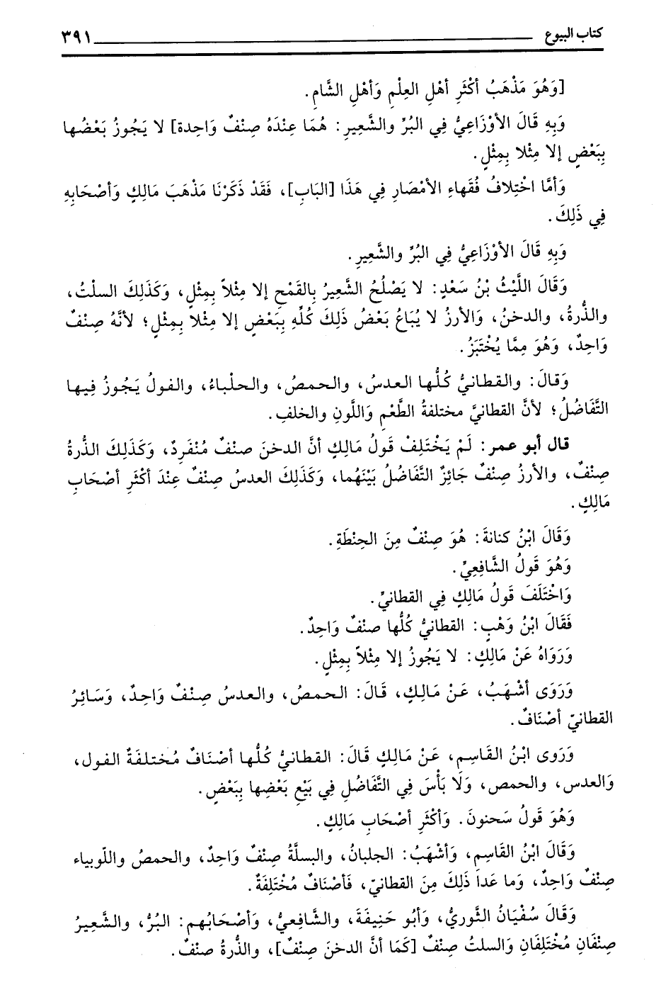 قَالَ أَبُو عُمَرَ هَذَا كُلُّهُ لَا خِلَافَ فِيهِ إِلَّا فِي قَبْضِ الشَّعِيرِ مِنَ الْقَمْحِ عِنْدَ مَحِلِّ الْأَجَلِ أَوْ بَعْدَهُ فَإِنَّ ذَلِكَ لَا يَجُوزُ عِنْدَ كُلِّ مَنْ يَجْعَلُ الشَّعِيرَ صِنْفًا غَيْرَ الْقَمْحِ وَالْقَمْحُ كُلُّهُ عِنْدَ الْجَمِيعِ صِنْفٌ وَاحِدٌ كَمَاءِ الشَّعِيرِ صِنْفٌ وَاحِدٌ وَكَمَاءِ الزَّبِيبِ أَحْمَرِهِ وَأَسْوَدِهِ صِنْفٌ وَاحِدٌ