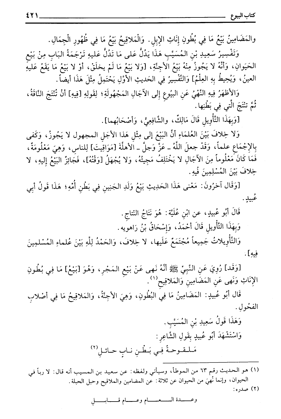 قَالَ أَبُو عُمَرَ يُحْتَمَلُ أَنْ يُحْتَجَّ لِمَذْهَبِ مَالِكٍ بِالْحَدِيثَيْنِ الْمَرْفُوعَيْنِ فِي هَذَا الْبَابِ حَدِيثِ عَبْدِ اللَّهِ بْنِ عَمْرِو بْنِ الْعَاصِ وَحَدِيثِ سَمُرَةَ فَيَكُونُ الْمَعْنَى فِي حَدِيثِ عَبْدِ اللَّهِ بْنِ عَمْرٍو وَإِذَا اخْتَلَفَتِ الْأَغْرَاضُ وَالْمَنَافِعُ عَلَى مَا وَصَفْنَا مِنْ مَذْهَبِهِ فِي ذَلِكَ