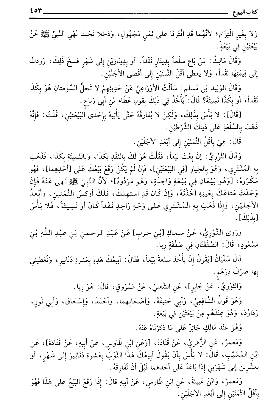 قال عيسى بن دينار سألت بن الْقَاسِمِ عَنْ تَفْسِيرِ بَيْعَتَيْنِ فِي بَيْعَةٍ فَقَالَ لِي بَيْعَتَيْنِ فِي بَيْعَةٍ أَكْثَرُ مِنْ أَنْ يَبْلُغَ لَكَ تَفْسِيرُهُ وَأَصْلُ مَا بَنَيْنَا عَلَيْهِ وَتَعْرِفُ بِهِ مَكْرُوهَهُمَا أَنَّهُمَا إِذَا تَبَايَعَا بِأَمْرٍ يَكُونُ إِذَا فُسِخَتْ إِحْدَاهُمَا فِي صَاحِبِهِ كَانَ حراما أو يكون إذ فُسِخَتْ إِحْدَاهُمَا فِي صَاحِبِهِ لَمْ يَكُنْ حَرَامًا وَكَانَ غَرَرًا لَا يَدْرِي مَا عَقَدَ بِهِ بَيْعَ سِلْعَتِهِ وَلَا مَا وَجَبَ لَهُ وَهَذَا مِنْ بَيْعَتَيْنِ فِي بَيْعَةٍ وَأَصْلُهَا الْغَرَرُ وَالْمُخَاطَرَةُ وَهُوَ فَسْخٌ إِنْ وَقَعَ إِلَّا أَنْ تَفُوتَ السِّلْعَةُ عِنْدَ مُبْتَاعِهَا فَيَكُونُ لَهُ بِقِيمَتِهَا يَوْمَ ابْتَاعَهَا