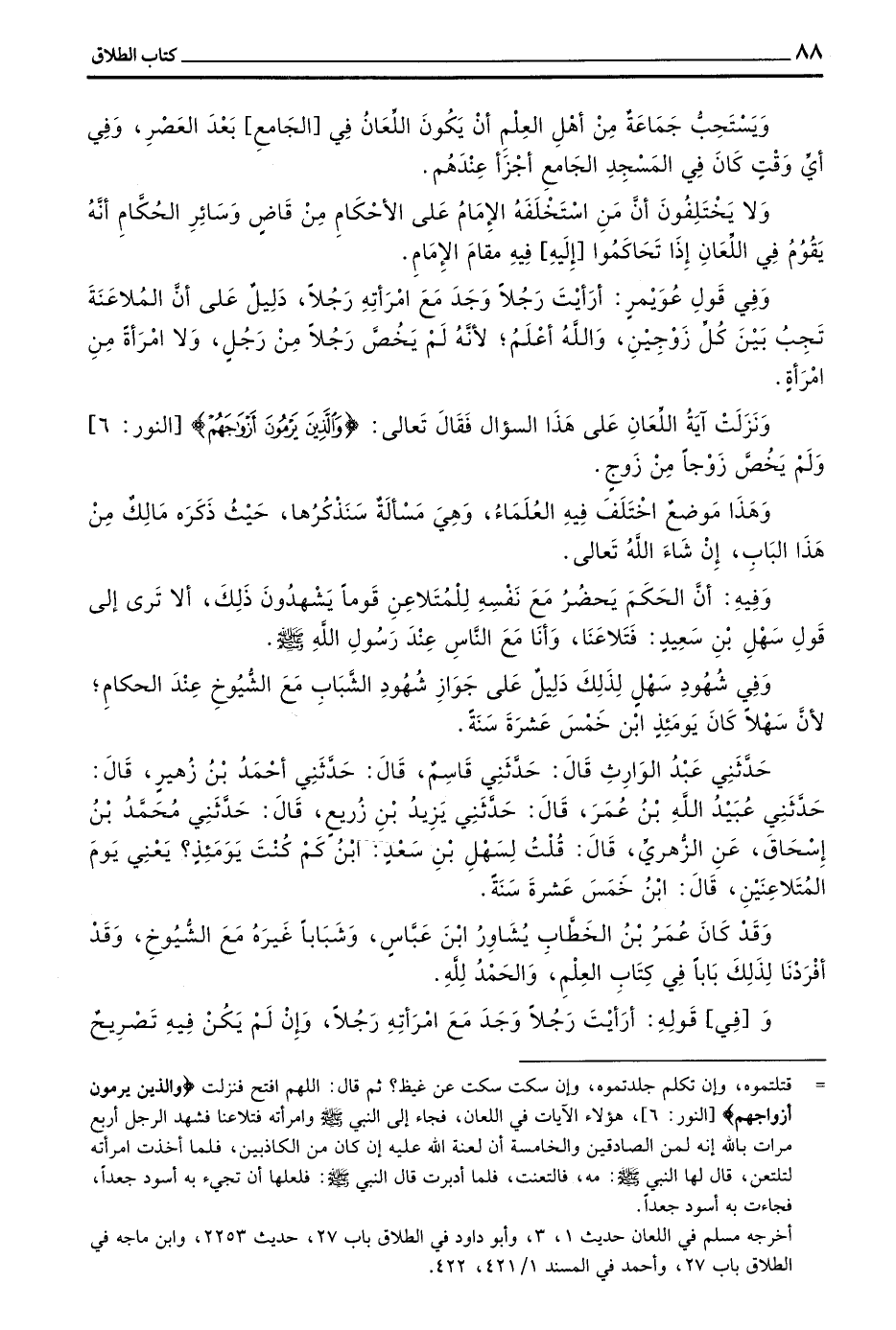 1152 - مَالِكٌ عن بن شِهَابٍ أَنَّ سَهْلَ بْنَ سَعْدٍ السَّاعِدِيَّ أَخْبَرَهُ أَنَّ عُوَيْمِرًا الْعَجْلَانِيَّ جَاءَ إِلَى عَاصِمِ بْنِ عَدِيٍّ الْأَنْصَارِيِّ فَقَالَ لَهُ يَا عَاصِمُ أَرَأَيْتَ رَجُلًا وَجَدَ مَعَ امْرَأَتِهِ رَجُلًا أَيَقْتُلُهُ فَتَقْتُلُونَهُ أَمْ كَيْفَ يَفْعَلُ سَلْ لِي يَا عَاصِمُ عَنْ ذَلِكَ رَسُولَ اللَّهِ صَلَّى اللَّهُ عَلَيْهِ وَسَلَّمَ فَسَأَلَ عَاصِمٌ رَسُولَ اللَّهِ صَلَّى اللَّهُ عَلَيْهِ وَسَلَّمَ عَنْ ذَلِكَ فَكَرِهَ رَسُولُ اللَّهِ صَلَّى اللَّهُ عَلَيْهِ وَسَلَّمَ الْمَسَائِلَ وَعَابَهَا حَتَّى كَبُرَ عَلَى عَاصِمٍ مَا سَمِعَ مِنْ رَسُولِ اللَّهِ صَلَّى اللَّهُ عَلَيْهِ وَسَلَّمَ فَلَمَّا رَجَعَ عَاصِمٌ إِلَى أَهْلِهِ جَاءَهُ عُوَيْمِرٌ فَقَالَ يَا عَاصِمُ مَاذَا قَالَ لَكَ رَسُولُ اللَّهِ صَلَّى اللَّهُ عَلَيْهِ وَسَلَّمَ فَقَالَ عَاصِمٌ لِعُوَيْمِرٍ لَمْ تَأْتِنِي بِخَيْرٍ قَدْ كَرِهَ رَسُولُ اللَّهِ صَلَّى اللَّهُ عَلَيْهِ وَسَلَّمَ الْمَسْأَلَةَ الَّتِي سَأَلْتُهُ عَنْهَا فَقَالَ عُوَيْمِرٌ وَاللَّهِ لَا أَنْتَهِي حَتَّى أَسْأَلَهُ عَنْهَا فَأَقْبَلَ عُوَيْمِرٌ حَتَّى آتِيَ رَسُولَ اللَّهِ صَلَّى اللَّهُ عَلَيْهِ وَسَلَّمَ وَسْطَ النَّاسِ فَقَالَ يَا رَسُولَ اللَّهِ أَرَأَيْتَ رَجُلًا وَجَدَ مَعَ امْرَأَتِهِ رَجُلًا أَيَقْتُلُهُ فَتَقْتُلُونَهُ أَمْ كَيْفَ يَفْعَلُ فَقَالَ رَسُولُ اللَّهِ صَلَّى اللَّهُ عَلَيْهِ وَسَلَّمَ ((قَدْ أُنْزِلَ فِيكَ وَفِي صَاحِبَتِكَ فَاذْهَبْ فَأْتِ بِهَا)) قَالَ سَهْلٌ فَتَلَاعَنَا وَأَنَا مَعَ