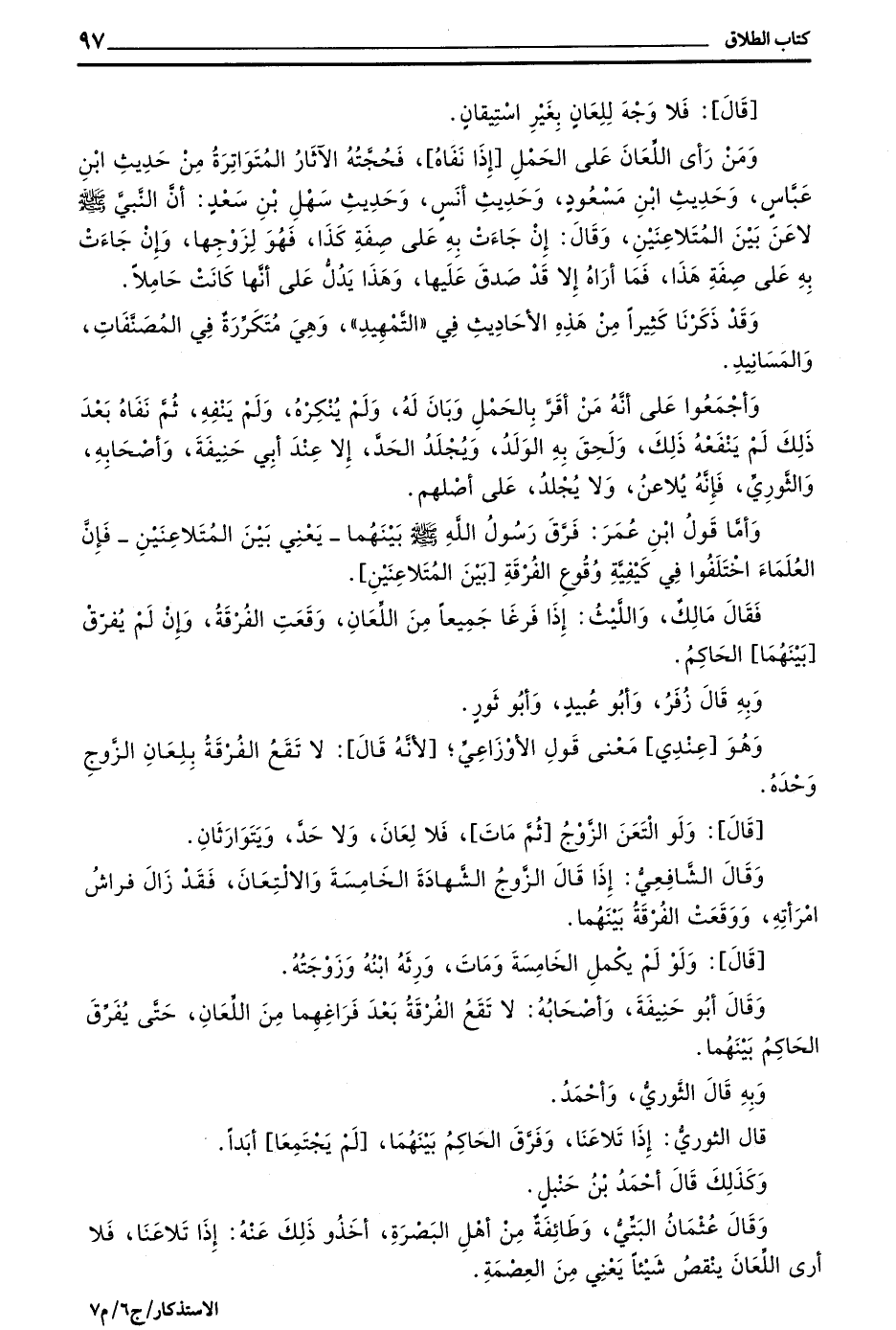 قَالَ أَبُو عُمَرَ جُمْلَةُ قَوْلِ مَالِكٍ وَأَصْحَابِهِ أَنَّ الْحَمْلَ لَا يَنْفِيهُ الزَّوْجُ بِمَا يَدَّعِيهِ مِنْ رُؤْيَةِ الزنى وَلَا يَنْتَفِي الْحَمْلُ إِلَّا بِدَعْوَى الِاسْتِبْرَاءِ وَأَنَّهُ لَمْ يَطَأْ بَعْدَ أَنِ اسْتَبْرَأَ