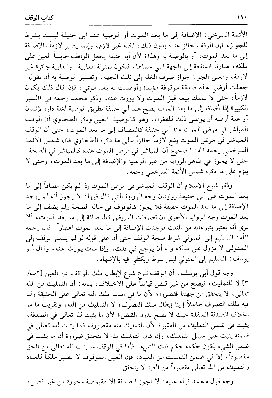 وذكر شيخ الإسلام أن الوقف المباشر في مرض الموت إذا لم يكن مضافاً إلى ما بعد الموت عن أبي حنيفة روايتان وجه الرواية التي قال (فيها) : لا يجوز أنه لم يوجد الإضافة إلى ما بعد الموت حقيقة فلا يجوز كالوقوف في حالة الصحة ولم يضف إلى ما بعد الموت وجه الرواية الأخرى أن تصرفات المريض كالمضافة إلى ما بعد الموت، ألا ترى أنه يعتبر بتبرعاته من الثلث فوجدت الإضافة إلى ما بعد الموت اعتباراً. قال رحمه الله: التسليم إلى المتولي شرط صحة الوقف حتى إن على قوله لو لم يسلم الوقف إلى المتولي لا يزول عن ملكه وله أن يرجع في ذلك، وإذا مات يورث عنه، وقال أبو يوسف: التسليم إلى المتولي ليس شرط ويكتفي فيه بالإشهاد.