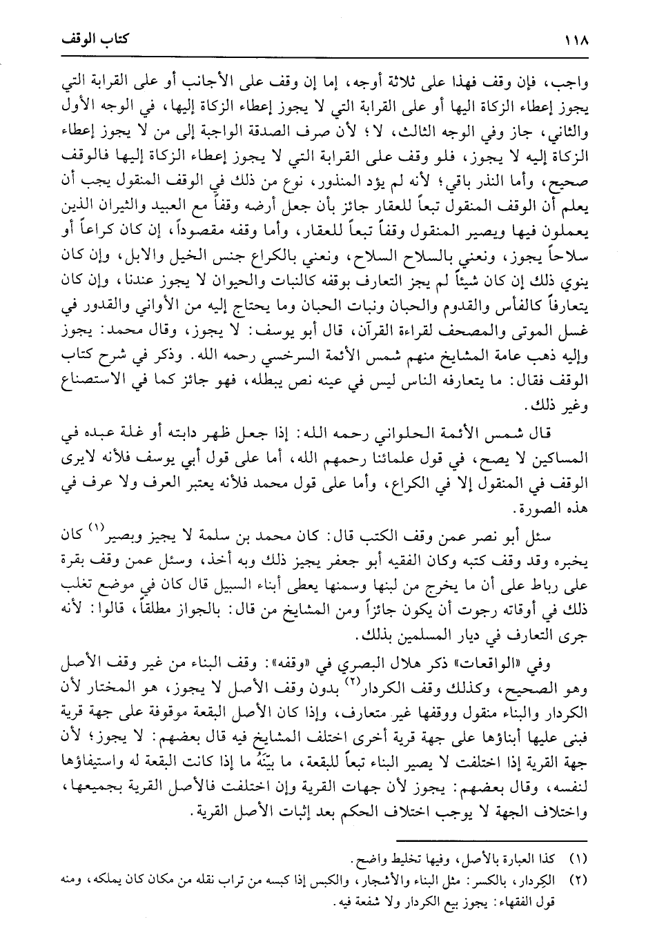 واجب، فإن وقف فهذا على ثلاثة أوجه، إما إن وقف على الأجانب أو على القرابة التي يجوز إعطاء الزكاة اليها أو على القرابة التي لا يجوز إعطاء الزكاة إليها، في الوجه الأول والثاني، جاز وفي الوجه الثالث، لا؛ لأن صرف الصدقة الواجبة إلى من لا يجوز إعطاء الزكاة إليه لا يجوز، فلو وقف على القرابة التي لا يجوز إعطاء الزكاة إليها فالوقف صحيح، وأما النذر باقي؛ لأنه لم يؤد المنذور، نوع من ذلك في الوقف المنقول يجب أن يعلم أن الوقف المنقول تبعاً للعقار جائز بأن جعل أرضه وقفاً مع العبيد والثيران الذين يعملون فيها ويصير المنقول وقفاً تبعاً للعقار، وأما وقفه مقصوداً، إن كان كراعاً أو سلاحاً يجوز، ونعني بالسلاح السلاح، ونعني بالكراع جنس الخيل والابل، وإن كان ينوي ذلك إن كان شيئاً لم يجز التعارف بوقفه كالنبات والحيوان لا يجوز عندنا، وإن كان يتعارفاً كالفأس والقدوم والحبان ونبات الحبان وما يحتاج إليه من الأواني والقدور في غسل الموتى والمصحف لقراءة القرآن، قال أبو يوسف: لا يجوز، وقال محمد: يجوز وإليه ذهب عامة المشايخ منهم شمس الأئمة السرخسي رحمه الله. وذكر في شرح كتاب الوقف فقال: ما يتعارفه الناس ليس في عينه نص يبطله، فهو جائز كما في الاستصناع وغير ذلك.