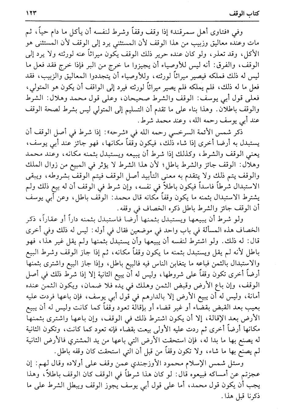 ولو شرط أن يبيعها ويستبدل بثمنها أرضا فاستبدل بثمنه داراً أو عقاراً، ذكر الخصاف هذه المسألة في باب واحد في موضعين فقال في أوله: ليس له ذلك وفي أخرى قال: له ذلك. ولو اشترط لنفسه أن يبيعها وأن يستبدل بثمنها ولم يقل غير هذا، فهو باطل لأنه لم يقل ويستبدل بثمنه ما يكون وقفاً مكانه، ثم إذا جاز الوقف وشرط البيع والاستبدال بالثمن فباعه ما يتغاين الناس فيه فالبيع باطل، وإذا جاز البيع واشترى بثمنها أرضاً أخرى تكون وقفاً على شروطها، وليس له أن يبيع الثانية إلا إذا شرط ذلك في أصل الوقف، وإن باع الأرض وقبض الثمن وهلك في يده فلا ضمان، ويكون الثمن عنده أمانة، وليس له أن يبيع الأرض إلا بالدارهم في قول أبي يوسف، فإن باعها فردت عليه بعيب بعد القبض بقضاء أو غير قضاء أو بإقالة تعود وقفاً كما كانت وليس له أن يبيع الأرض بعد الإقالة، إلا أن يكون اشترط ذلك في الوقف، وإن باعها واشترى بثمنها مكانها أرضاً أخرى ثم ردت عليه الأولى بيعت بقضاء فإنه تعود كما كانت، وتكون الثانية له يصنع بها ما بدا له، فإن استحقت الأرض التي باعها من يد المشتري فالأرض الثانية لم يصنع بها ما شاء، ولا تكون وقفاً من قبل أن التي استحقت كان وقفه باطل.