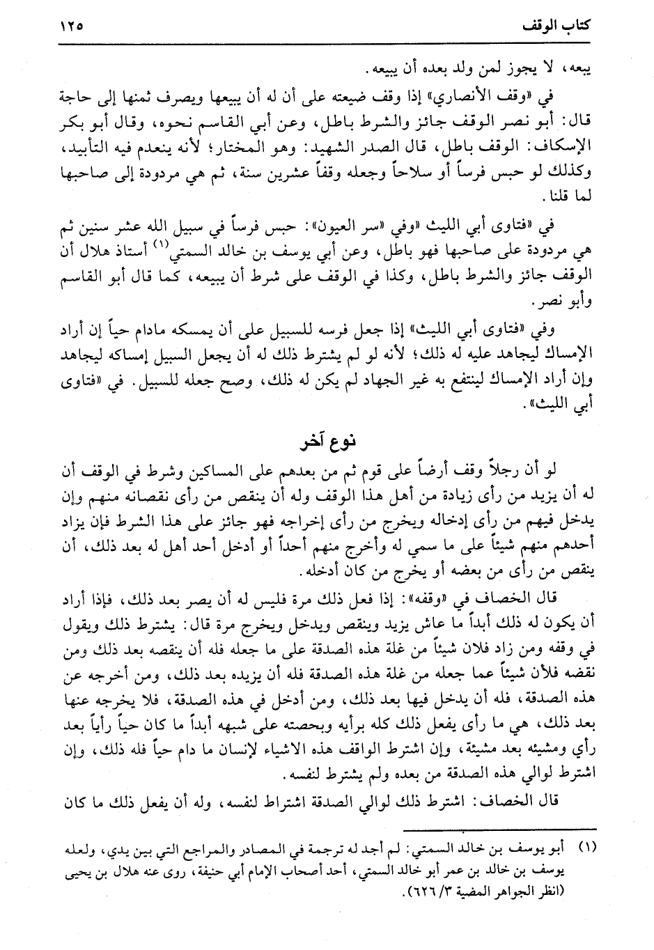 في «فتاوى أبي الليث «وفي «سر العيون» : حبس فرساً في سبيل الله عشر سنين ثم هي مردودة على صاحبها فهو باطل، وعن أبي يوسف بن خالد السمتي أستاذ هلال أن الوقف جائز والشرط باطل، وكذا في الوقف على شرط أن يبيعه، كما قال أبو القاسم وأبو نصر.