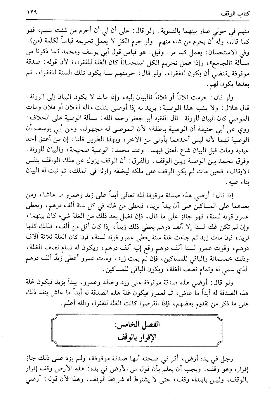 ولو قال: على أن لي (أن) أحرم من شئت منهم، فهو كما قال، وله أن يحرم من شاء منهم. ولو حرم الكل لا يعمل تحريمه قياساً (حصته) لكلمة (من) . وفي الاستحسان: يعمل كما مر. وقيل: هو قياس قول أبي يوسف ومحمد كما ذكرنا من مسألة «الجامع» ، وإذا عمل تحريم الكل استحساناً كان الغلة للفقراء؛ لأن قوله: صدقة موقوفة يقتضي أن يكون للفقراء. ولو قال: حرمتهم سنة يكون تلك السنة للفقراء، ثم بعدها يكون لهم.