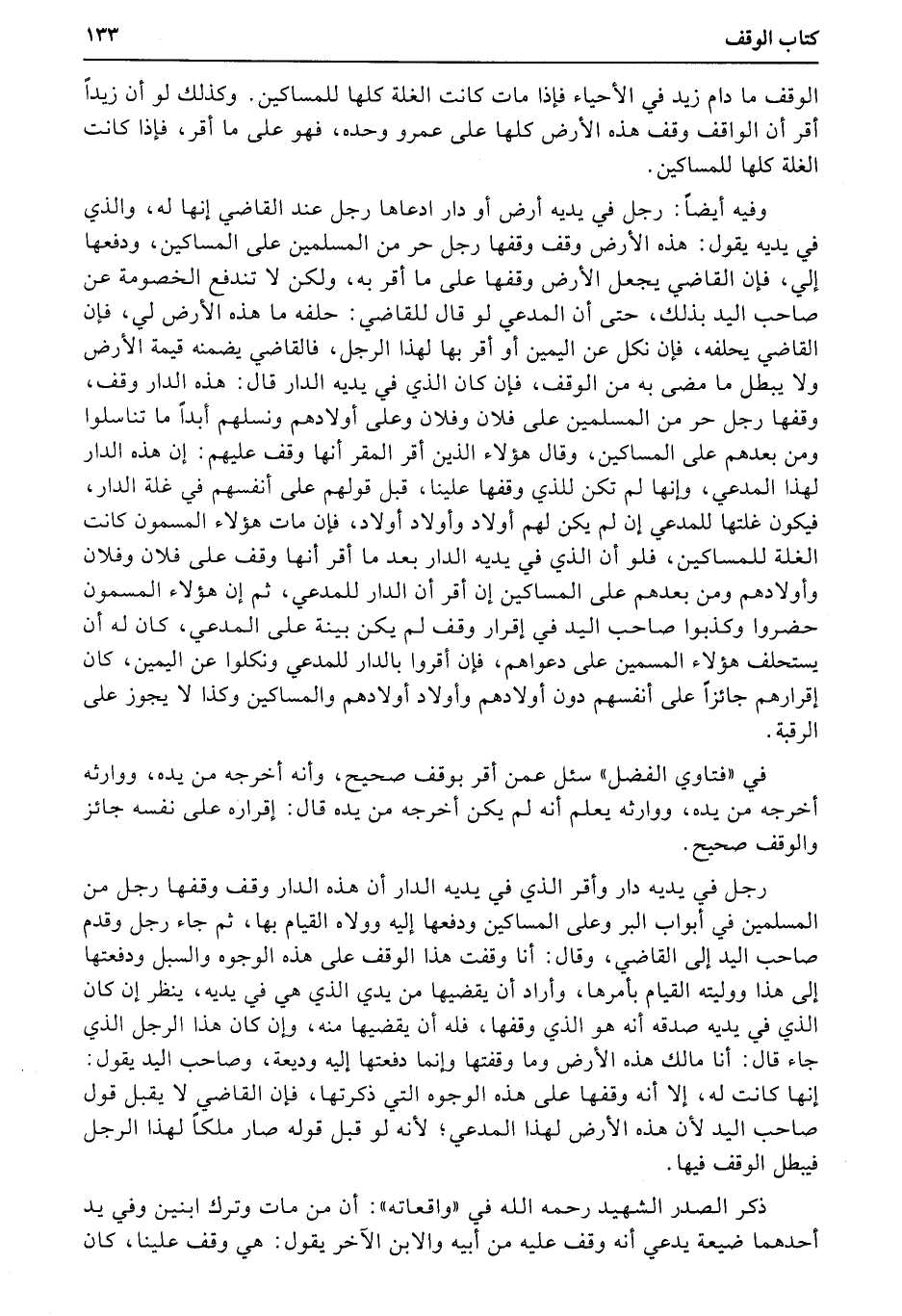 وفيه أيضاً: رجل في يديه أرض أو دار ادعاها رجل عند القاضي إنها له، والذي في يديه يقول: هذه الأرض وقف وقفها رجل حر من المسلمين على المساكين، ودفعها إلي، فإن القاضي يجعل الأرض وقفها على ما أقر به، ولكن لا تندفع الخصومة عن صاحب اليد بذلك، حتى أن المدعي لو قال للقاضي: حلفه ما هذه الأرض لي، فإن القاضي يحلفه، فإن نكل عن اليمين أو أقر بها لهذا الرجل، فالقاضي يضمنه قيمة الأرض ولا يبطل ما مضى به من الوقف، فإن كان الذي في يديه الدار قال: هذه الدار وقف، وقفها رجل حر من المسلمين على فلان وفلان وعلى أولادهم ونسلهم أبداً ما تناسلوا ومن بعدهم على المساكين، وقال هؤلاء الذين أقر المقر أنها وقف عليهم: إن هذه الدار لهذا المدعي، وإنها لم تكن للذي وقفها علينا، قبل قولهم على أنفسهم في غلة الدار، فيكون غلتها للمدعي إن لم يكن لهم أولاد وأولاد أولاد، فإن مات هؤلاء المسمون كانت الغلة للمساكين، فلو أن الذي في يديه الدار بعد ما أقر أنها وقف على فلان وفلان وأولادهم ومن بعدهم على المساكين إن أقر أن الدار للمدعي، ثم إن هؤلاء المسمون حضروا وكذبوا صاحب اليد في إقرار وقف لم يكن بينة على المدعي، كان له أن يستحلف هؤلاء المسمين على دعواهم، فإن أقروا بالدار للمدعي ونكلوا عن اليمين، كان إقرارهم جائزاً على أنفسهم دون أولادهم وأولاد أولادهم والمساكين وكذا لا يجوز على الرقبة.