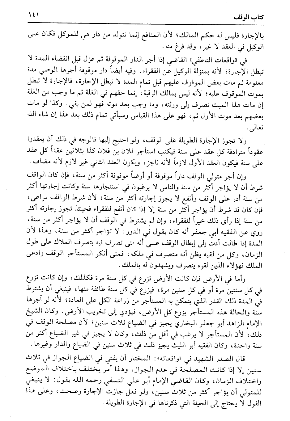 وكان الشيخ الإمام الزاهد أبو جعفر البخاري يجيز في الضياع ثلاث سنين؛ لأن مصلحة الوقف في ذلك؛ لأن المستأجر لا يرغب في أقل من ذلك، وكان لا يجيز في غير الضياع أكثر من سنة واحدة، وكان الفقيه أبو الليث يجيز ذلك في ثلاث سنين في الضياع والدار وغيرها.