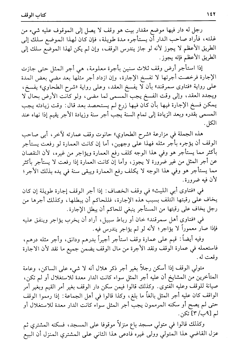 إذا استأجر أرض وقف ثلاث سنين بأجرة معلومة، هي أجر المثل حتى جازت الإجارة فرخصت أجرتها لا تفسخ الإجارة، وإن ازداد أجر مثلها بعد مضي بعض المدة على رواية «فتاوى سمرقند» بأن لا يفسخ العقد، وعلى رواية «شرح الطحاوي» يفسخ، ويجدد العقد، وإلى وقت الفسخ يجب المسمى لما مضى، ولو كانت الأرض بحال لا يمكن فسخ الإجارة فيها بأن كان فيها زرع لم يستحصد بعد قال: وقت زيادته يجب المسمى بقدره وبعد الزيادة إلى تمام السنة يجب أجر سنة وزيادة الأجر يقيم إذا نهاه عند الكل.
