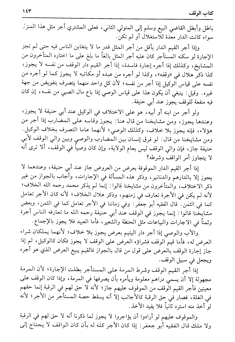 إذا أجر القيم الدار الموقوفة بعرض من العروض جاز عند أبي حنيفة، وعندهما لا يجوز إلا بالدارهم والدنانير، وذكر هذه المسألة في الإجارات، وأجاب بالجواز من غير ذكر الاختلاف، والمتأخرون من مشايخنا قالوا: إنما لم يذكر محمد رحمه الله الخلاف؛ لأنه لم يكن في الأجرة تعارف في زمنهم، وذكر هلال الخلاف؛ لأنه كان الأجر تعامل كما في الثمن. قال الفقيه أبو جعفر: وفي زماننا في الأجر تعامل كما في الثمن، وبعض مشايخنا قالوا: إنما يجوز في الوقف عند أبي حنيفة رحمه الله ما تعارفه الناس أجرة وثمناً في الاجارات والبياعات مثل الحنطة والشعير، فأما العبيد فلا يجوز بالإجماع.