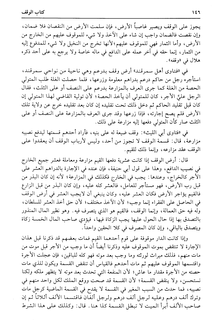 قال: أرض الوقف إذا كانت عشرية دفعها القيم مزارعة ومعاملة فعشر جميع الخارج في نصيب الدافع، وهذا على قول أبي حنيفة، فإن عنده في الإجارة بالدراهم العشر على الأجر كالخراج، وعندها: يجب في الخارج فكذلك في المزارعة؛ لأنه إن كان البذر من قبل رب الأرض، فهو مستأجر للعامل، فالعشر كله عليه، وإن كان البذر من قبل الزارع فالقيم يؤاجر الأرض فكان العشر عليه، وكان ينبغي أن لايجب العشر في أرض الوقف في الحاصل على الفقراء إنما وجب؛ لأن الآخذ مختلف؛ لأن حق أخذ العشر للسلطان، وله فيه حق العمالة، وإنما الوقف، فالقيم هو الذي يتصرف فيه. وهو نظير المال المنذور بالتصدق بها إذا حال الحول عليها يجب الزكاة فيها، فيؤدي صاحب المال الخمسة زكاة ويتصدق بالباقي، وإن كان المصرف في كلا الحقين واحداً.