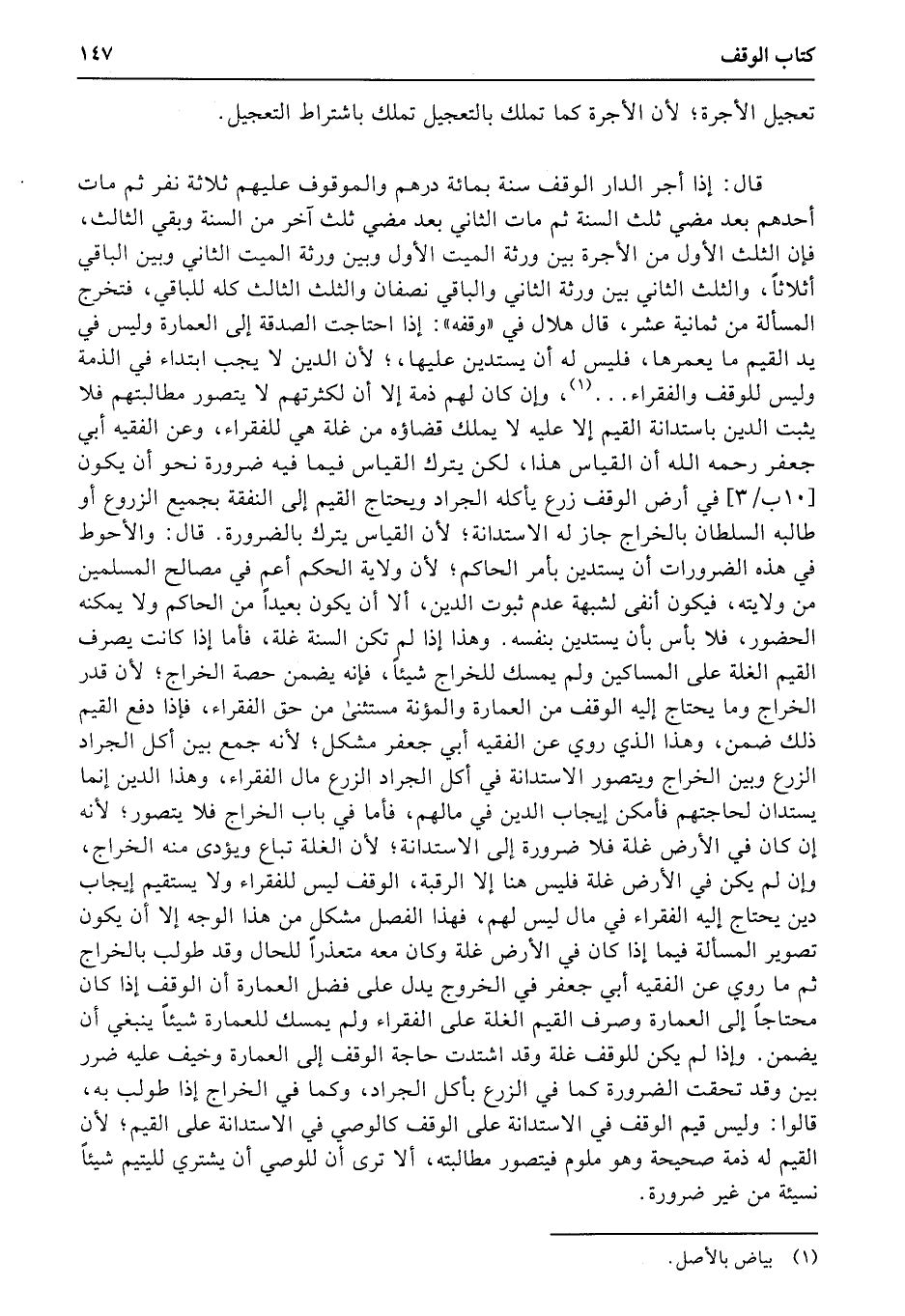 قال: إذا أجر الدار الوقف سنة بمائة درهم والموقوف عليهم ثلاثة نفر ثم مات أحدهم بعد مضي ثلث (السنة ثم مات الثاني بعد مضي ثلث) آخر من السنة وبقي الثالث، فإن الثلث الأول من الأجرة بين ورثة الميت الأول وبين ورثة الميت الثاني وبين الباقي أثلاثاً، والثلث الثاني بين ورثة الثاني والباقي نصفان والثلث الثالث كله للباقي، فتخرج المسئلة من ثمانية عشر، قال هلال في «وقفه» : إذا احتاجت الصدقة إلى العمارة وليس في يد القيم ما يعمرها، فليس له أن يستدين عليها،؛ لأن الدين لا يجب ابتداء في الذمة وليس للوقف والفقراء.، وإن كان لهم ذمة إلا أن لكثرتهم لا يتصور مطالبتهم فلا يثبت الدين باستدانة القيم إلا عليه لا يملك قضاؤه من غلة هي للفقراء، وعن الفقيه أبي جعفر رحمه الله أن القياس هذا، لكن يترك القياس فيما فيه ضرورة نحو أن يكون (10ب3) في أرض الوقف زرع يأكله الجراد ويحتاج القيم إلى النفقة بجميع الزروع أو طالبه السلطان بالخراج جاز له الاستدانة؛ لأن القياس يترك بالضرورة. قال: والأحوط في هذه الضرورات أن يستدين بأمر الحاكم؛ لأن ولاية الحكم أعم في مصالح المسلمين من ولايته، فيكون أنفى لشبهة عدم ثبوت الدين، ألا (أن) يكون بعيداً من الحاكم ولا يمكنه الحضور، فلا بأس بأن يستدين بنفسه. وهذا إذا لم تكن السنة غلة، فأما إذا كانت يصرف القيم الغلة على المساكين ولم يمسك للخراج شيئاً، فإنه يضمن حصة الخراج؛ لأن قدر الخراج وما يحتاج إليه الوقف من العمارة والمؤنة مستثنى من حق الفقراء، فإذا دفع القيم ذلك ضمن، وهذا الذي روي عن الفقيه أبي جعفر مشكل؛ لأنه جمع بين أكل الجراد الزرع وبين الخراج ويتصور الاستدانة في أكل الجراد الزرع مال الفقراء، وهذا الدين إنما يستدان لحاجتهم فأمكن إيجاب الدين في مالهم، فأما في باب الخراج فلا يتصور؛ لأنه إن كان في الأرض غلة فلا ضرورة إلى الاستدانة؛ لأن الغلة تباع ويؤدى منه الخراج، وإن لم يكن في الأرض