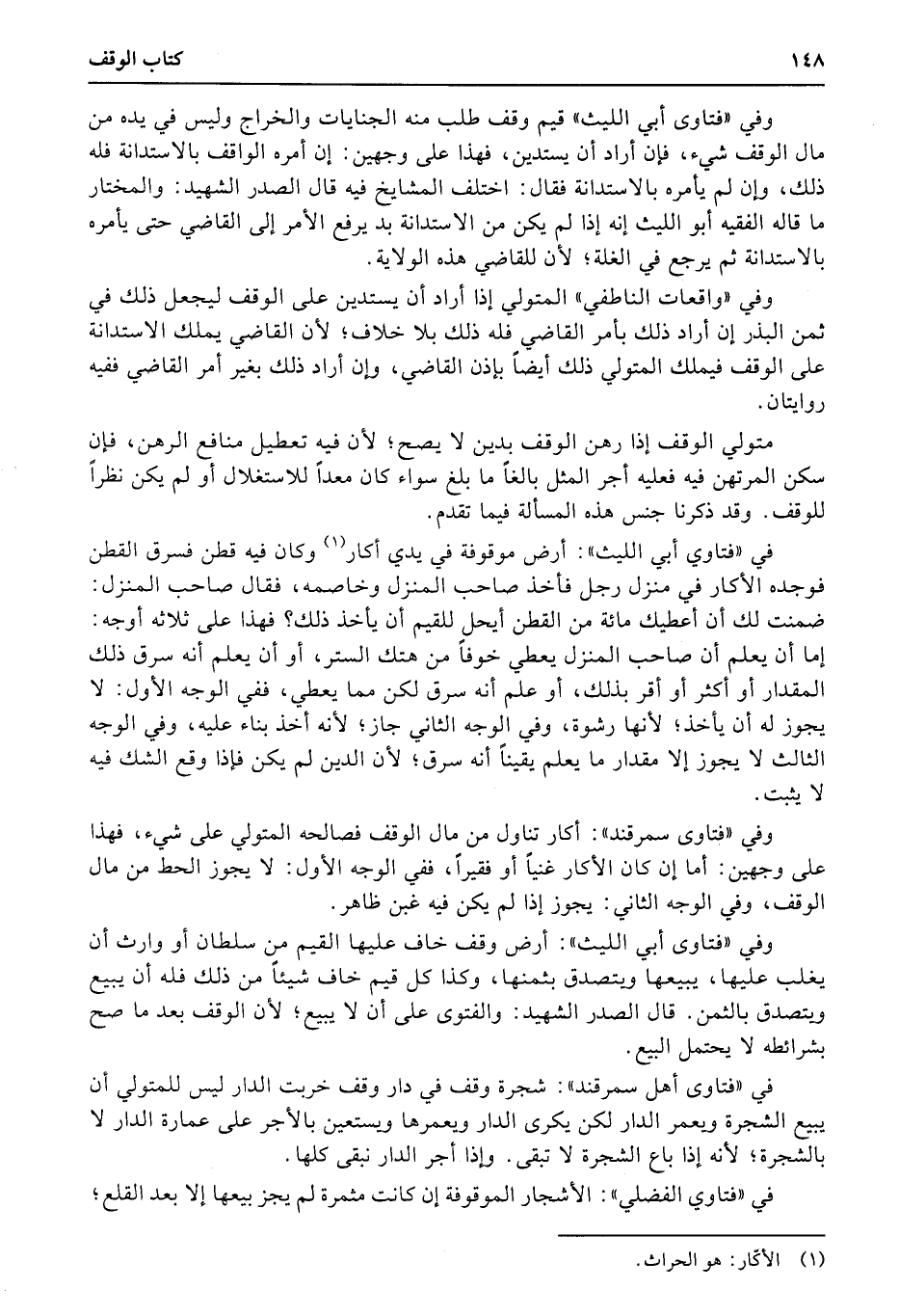 وفي «فتاوى سمرقنديان» : أكار تناول من مال الوقف فصالحه المتولي على شيء، فهذا على وجهين: أما إن كان الأكار غنياً أو فقيراً، ففي الوجه الأول: لا يجوز الحط من مال الوقف، وفي الوجه الثاني: يجوز إذا لم يكن فيه غبن ظاهر.