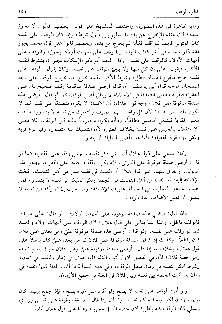 وكان ينبغي على قول هلال أن يلغي ذكر نفسه ويجعل وقفاً على الفقراء كما لو قال: أرضي صدقة موقوفة على الموتى، فإنه يكون وقفاً صحيحاً على الفقراء، ويلغوا ذكر الموتى، والفرق بينهما على قول هلال أن الميت في نفسه ليس من أهل التمليك، فلغت الإضافة إليه، أما نفسه من أهل التمليك في الجملة ولكن تمليكه من نفسه لا يتصور، فمن حيث إنه أهل التمليك في الجملة اعتبرت الإضافة، ومن حيث إن تمليكه من نفسه لا يتصور لا تعتبر الإضافة، عند الوقف.
