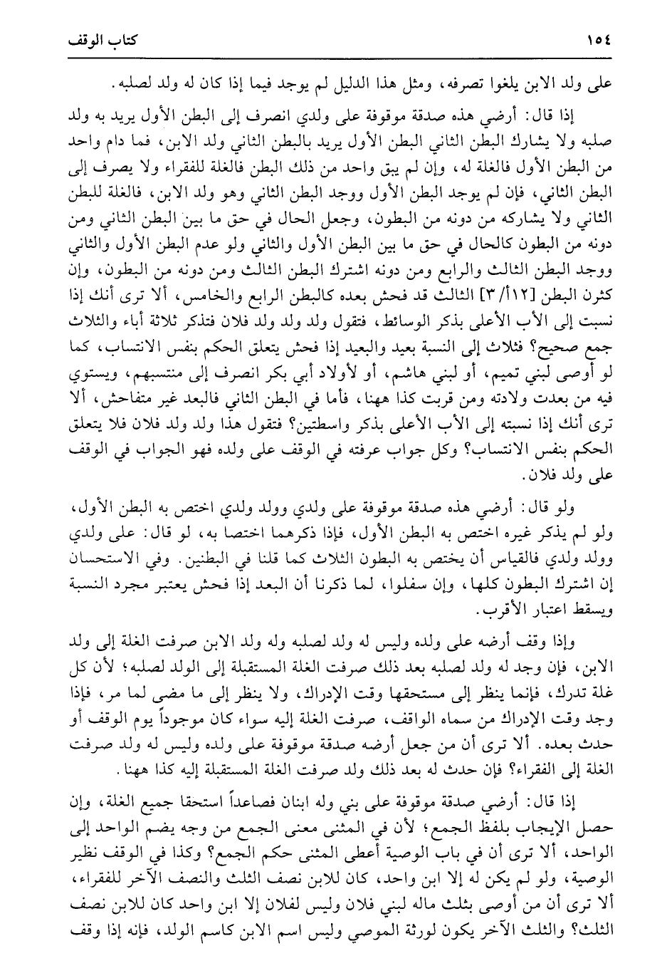 إذا قال: أرضي هذه صدقة موقوفة على ولدي انصرف إلى البطن الأول يريد به ولد صلبه ولا يشارك البطن الثاني البطن الأول يريد بالبطن الثاني ولد الابن، فما دام واحد من البطن الأول فالغلة له، وإن لم يبق واحد من ذلك البطن فالغلة للفقراء ولا يصرف إلى البطن الثاني، فإن لم يوجد البطن الأول ووجد البطن الثاني وهو ولد الابن، فالغلة للبطن الثاني ولا يشاركه من دونه من البطون، وجعل الحال في حق ما بين البطن الثاني ومن دونه من البطون كالحال في حق ما بين البطن الأول والثاني ولو عدم البطن الأول والثاني ووجد البطن الثالث والرابع ومن دونه اشترك البطن الثالث ومن دونه من البطون، وإن كثرن البطن (12أ3) الثالث قد فحش بعده كالبطن الرابع والخامس، ألا ترى أنك إذا نسبت إلى الأب الأعلى بذكر الوسائط، فتقول ولد ولد ولد فلان فتذكر ثلاثة أباء والثلاث جمع صحيح؟ فثلاث إلى النسبة بعيد والبعيد إذا فحش يتعلق الحكم بنفس الانتساب، كما لو أوصى لبني تميم، أو لبني هاشم، أو لأولاد أبي بكر انصرف إلى منتسبهم، ويستوي فيه من بعدت ولادته ومن قربت كذا ههنا، فأما في البطن الثاني فالبعد غير متفاحش، ألا ترى أنك إذا نسبته إلى الأب الأعلى بذكر واسطتين؟ فتقول هذا ولد ولد فلان فلا يتعلق الحكم بنفس الانتساب؟ وكل جواب عرفته في الوقف على ولده فهو الجواب في الوقف على ولد فلان.