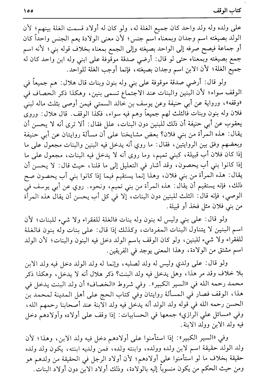 ولو قال: أرضي صدقة موقوفة على بني وله بنون وبنات قال هلال: هم جميعاً في الوقف سواء؛ لأن البنين والبنات عند الاجتماع تسمى بنين، وهكذا ذكر الحصاف في «وقفه» ، ورواية عن أبي حنيفة وعن يوسف بن خالد السمتي فيمن أوصى بثلث ماله لبني فلان وله بنون وبنات فالثلث لهم جميعاً وهم فيه سواء، فكذا الوقف. قال هلال: وروى يعقوب عن أبي حنيفة أن ذلك للبنين دون البنات، علل فقال: ألا ترى أنه لا يحسن أن يقال: هذه المرأة من بني فلان؟ بعض مشايخنا على أن مسألة روايتان عن أبي حنيفة وبعضهم وفق بين الروايتين، فقال: ما روي أنه يدخل فيه البنين والبنات مجعول على ما إذا كان فلان أب قبيلة، كبني تميم، وما روى أنه لا يدخل فيه البنات، مجعول على ما إذا كانوا بني أب يحصون، وقد أشار في التعليل إلى ما قلنا، حيث قال: لا يحسن أن يقال: هذه المرأة من بني فلان، وهذا إنما يستقيم فيما إذا كانوا بني أب يحصون صح ذلك، فإنه يستقيم أن يقال: هذه المرأة من بني تميم، ونحوه. روي عن أبي يوسف في الوصي، فإنه قال: الثلث للبنين دون البنات، إلا في كل أب يحسن أن يقال هذه المرأة من بني فلان مثل فخذ أو قبيلة.