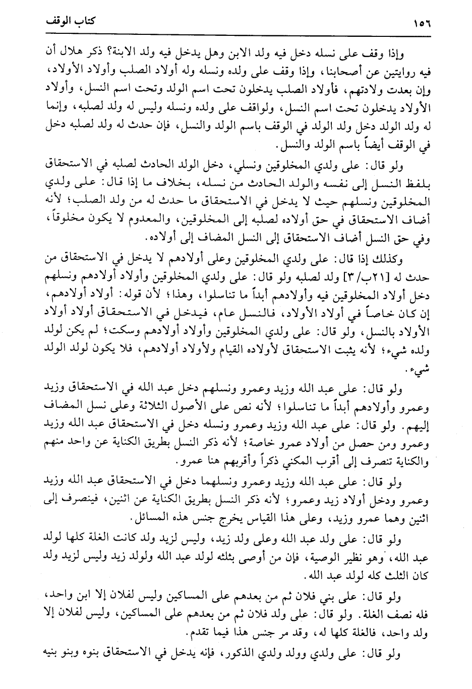 ولو قال: على عبد الله وزيد وعمرو ونسلهم دخل عبد الله في الاستحقاق وزيد وعمرو وأولادهم أبداً ما تناسلوا؛ لأنه نص على الأصول الثلاثة وعلى نسل المضاف إليهم. ولو قال: على عبد الله وزيد وعمرو ونسله دخل في الاستحقاق عبد الله وزيد وعمرو ومن حصل من أولاد عمرو خاصة؛ لأنه ذكر النسل بطريق الكناية عن واحد منهم والكناية تنصرف إلى أقرب المكني ذكراً وأقربهم هنا عمرو.