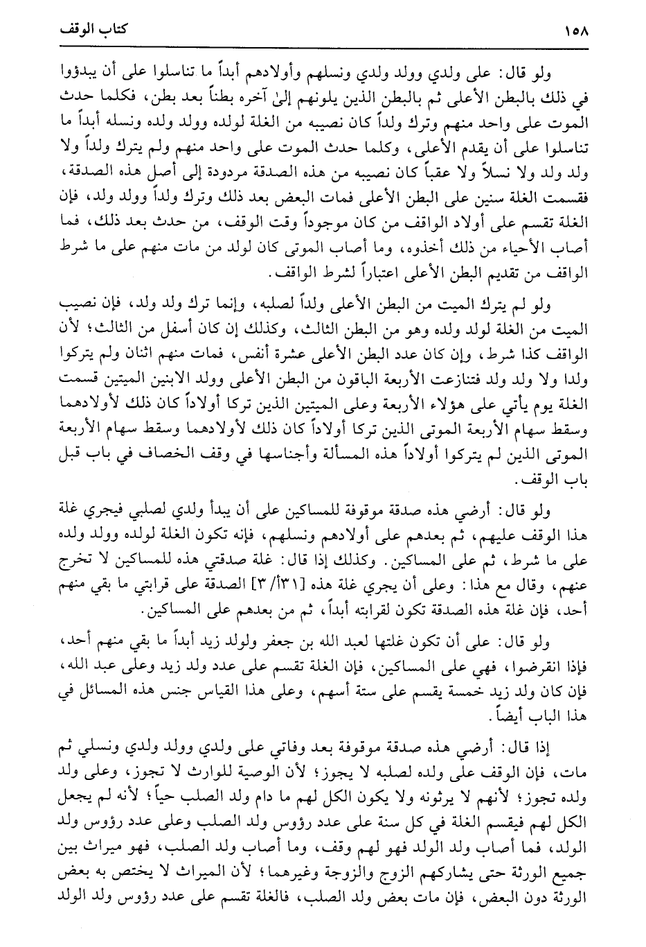 ولو قال: أرضي هذه صدقة موقوفة للمساكين على أن يبدأ ولدي لصلبي فيجري غلة هذا الوقف عليهم، ثم بعدهم على أولادهم ونسلهم، فإنه تكون الغلة لولده وولد ولده على ما شرط، ثم على المساكين. وكذلك إذا قال: غلة صدقتي هذه للمساكين لا تخرج عنهم، وقال مع هذا: وعلى أن يجري غلة هذه (31أ3) الصدقة على قرابتي ما بقي منهم أحد، فإن غلة هذه الصدقة تكون لقرابته أبداً، ثم من بعدهم على المساكين.