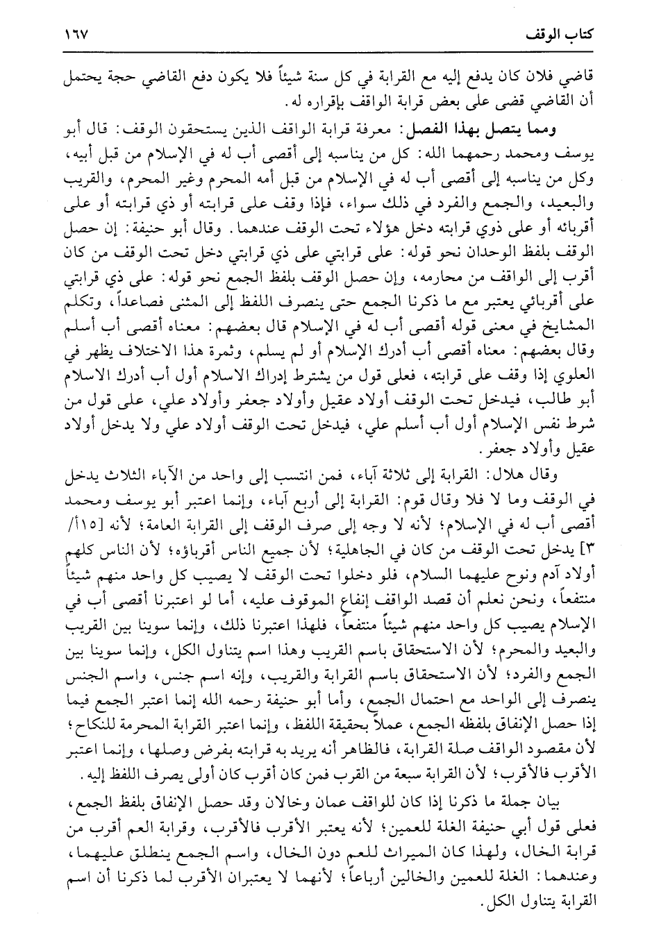 ومما يتصل بهذا الفصل معرفة قرابة الواقف الذين يستحقون الوقف: قال أبو يوسف ومحمد رحمهما الله: كل من يناسبه إلى أقصى أب له في الإسلام من قبل أبيه، وكل من يناسبه إلى أقصى أب له في الإسلام من قبل أمه المحرم وغير المحرم، والقريب والبعيد، والجمع والفرد في ذلك سواء، فإذا وقف على قرابته أو ذي قرابته أو على أقربائه أو على ذوي قرابته دخل هؤلاء تحت الوقف عندهما. وقال أبو حنيفة: إن حصل الوقف بلفظ الوحدان نحو قوله: على قرابتي على ذي قرابتي دخل تحت الوقف من كان أقرب إلى الواقف من محارمه، وإن حصل الوقف بلفظ الجمع نحو قوله: على ذي قرابتي على أقربائي يعتبر مع ما ذكرنا الجمع حتى ينصرف اللفظ إلى المثنى فصاعداً، وتكلم المشايخ في معنى قوله أقصى أب له في الإسلام قال بعضهم: معناه أقصى أب أسلم وقال بعضهم: معناه أقصى أب أدرك الإسلام أو لم يسلم، وثمرة هذا الاختلاف يظهر في العلوي إذا وقف على قرابته، فعلى قول من يشترط إدراك الاسلام أول أب أدرك الاسلام أبو طالب، فيدخل تحت الوقف أولاد عقيل وأولاد جعفر وأولاد علي، على قول من شرط نفس الإسلام أول أب أسلم علي، فيدخل تحت الوقف أولاد علي ولا يدخل أولاد عقيل وأولاد جعفر.