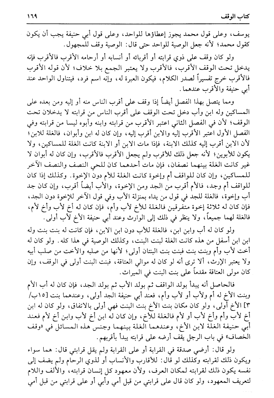 فالحاصل أنه يبدأ بولد الواقف ثم بولد الأب ثم بولد الجد، فإن كان له أب الأم وبنت الأخ له أم ولأب أو لأب وأم، فعند أبي حنيفة الجد أولى، وعندهما بنت (15ب3) الأخ أولى، ولو كان مكان بنت الأخ بنت البنت فهي أولى بالاتفاق، ولو كان له ابن أخ لأب وأم وأخ لأب أو لأم فالغلة للأخ، وإن كان له ابن أخ لأب وابن أخ لأم فعند أبي حنيفة الغلة لابن الأخ، وعندهما الغلة بينهما وجنس هذه المسائل في «وقف الخصاف» في باب الرجل يقف أرضه على قرابته يبدأ بأقربهم.