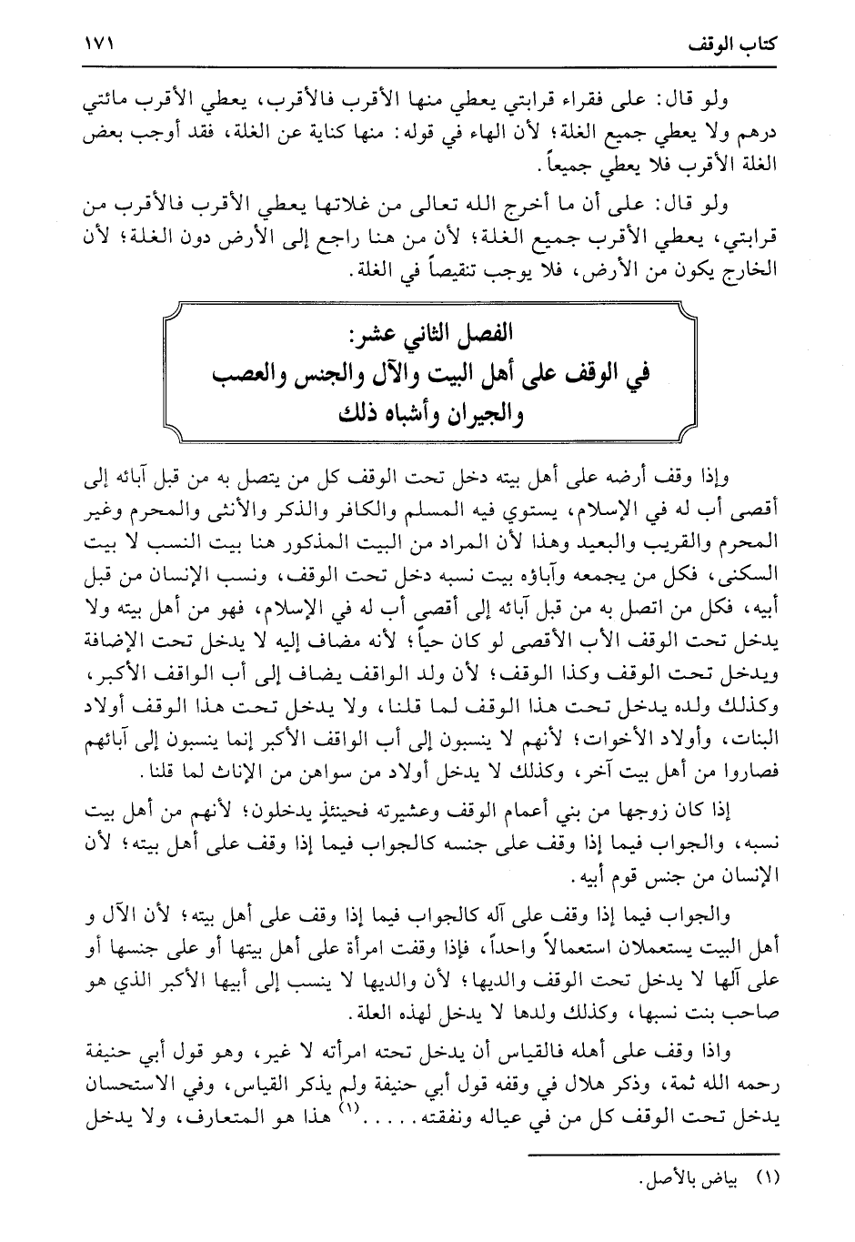 الفصل الثاني عشر: في الوقف على أهل البيت والآل والجنس والعصب والجيران وأشباه ذلك