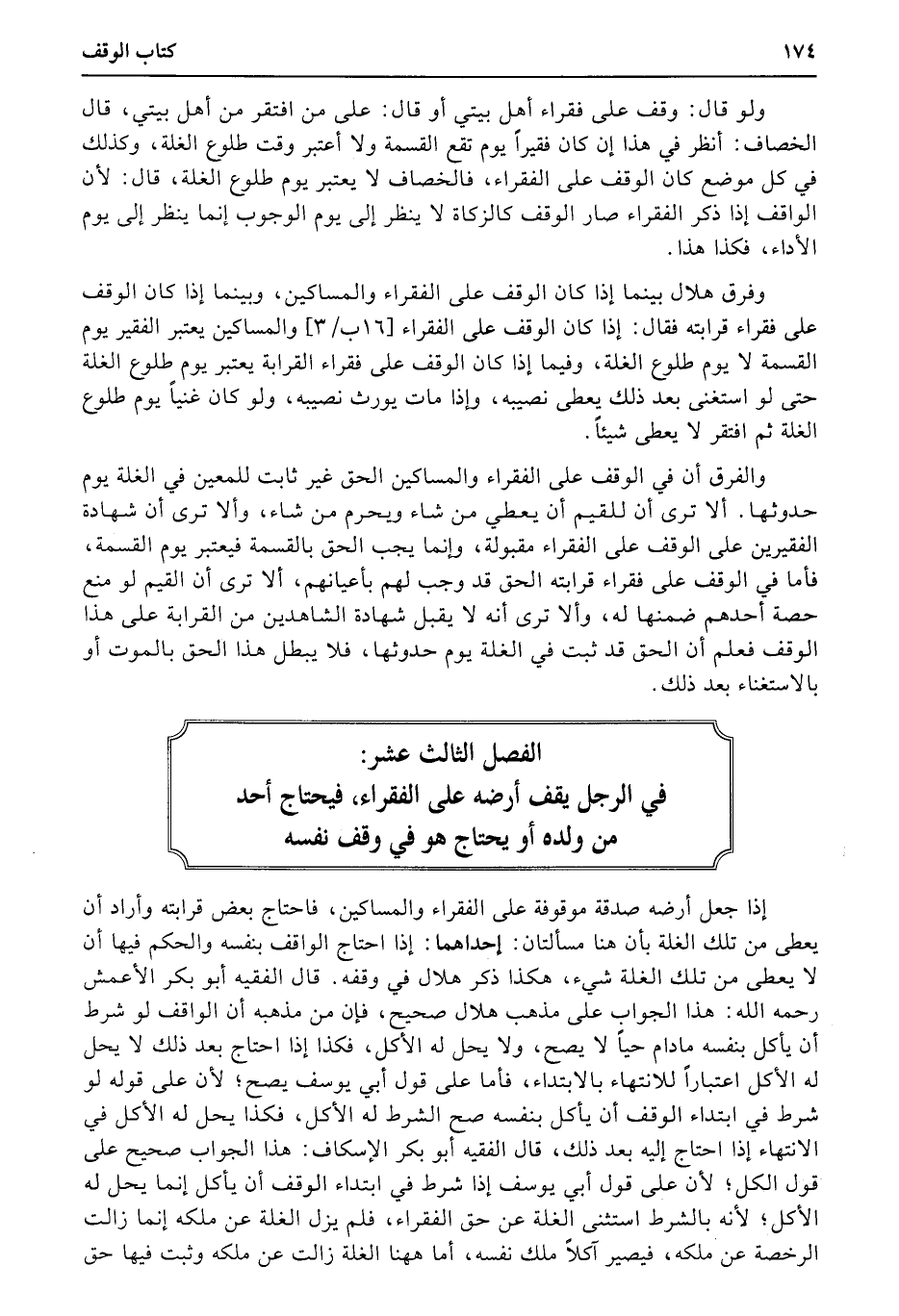 الفصل الثالث عشر: في الرجل يقف أرضه على الفقراء، فيحتاج أحدمن ولده أو يحتاج هو في وقف نفسه