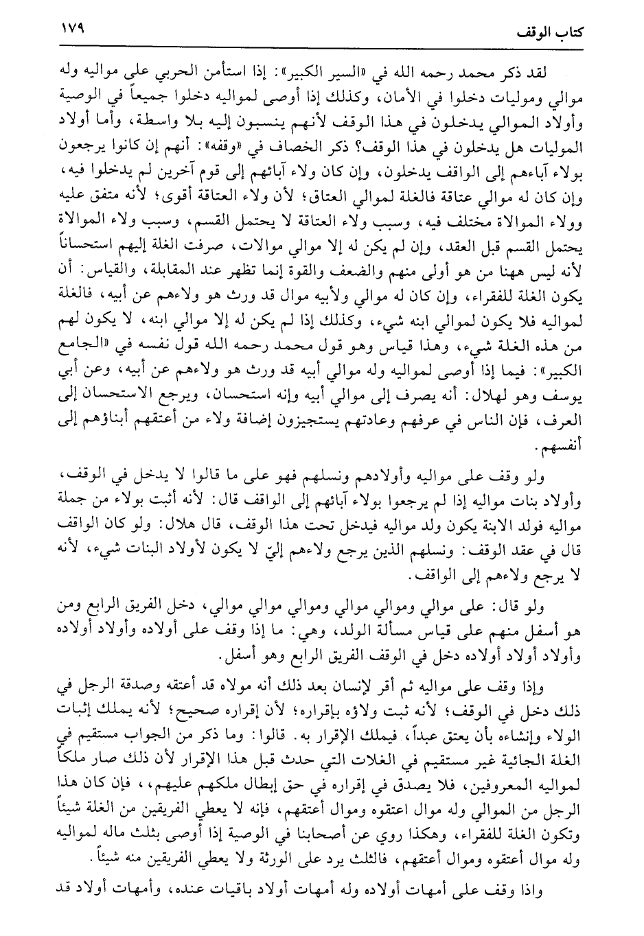 لقد ذكر محمد رحمه الله في «السير الكبير» : إذا استأمن الحربي على مواليه وله موالى وموليات دخلوا في الأمان، وكذلك إذا أوصى لمواليه دخلوا جميعاً في الوصية وأولاد الموالي يدخلون في هذا الوقف لأنهم ينسبون إليه بلا واسطة، وأما أولاد الموليات هل يدخلون في هذا الوقف؟ ذكر الخصاف في «وقفه» : أنهم إن كانوا يرجعون بولاء آباءهم إلى الواقف يدخلون، وإن كان ولاء آبائهم إلى قوم آخرين لم يدخلوا فيه، وإن كان له موالي عتاقة فالغلة لموالي العتاق؛ لأن ولاء العتاقة أقوى؛ لأنه متفق عليه وولاء الموالاة مختلف فيه، وسبب ولاء العتاقة لا يحتمل القسم، وسبب ولاء الموالاة يحتمل القسم قبل العقد، وإن لم يكن له إلا موالي موالات، صرفت الغلة إليهم استحساناً لأنه ليس ههنا من هو أولى منهم والضعف والقوة إنما تظهر عند المقابلة، والقياس: أن يكون الغلة للفقراء، وإن كان له موالي ولأبيه موال قد ورث هو ولاءهم عن أبيه، فالغلة لمواليه فلا يكون لموالي ابنه شيء، وكذلك إذا لم يكن له إلا موالي ابنه، لا يكون لهم من هذه الغلة شيء، وهذا قياس وهو قول محمد رحمه الله قول نفسه في «الجامع الكبير» : فيما إذا أوصى لمواليه وله موالي أبيه قد ورث هو ولاءهم عن أبيه، وعن أبي يوسف وهو لهلال: أنه يصرف إلى موالي أبيه وإنه استحسان، ويرجع الاستحسان إلى العرف، فإن الناس في عرفهم وعادتهم يستجيزون إضافة ولاء من أعتقهم أبناؤهم إلى أنفسهم.