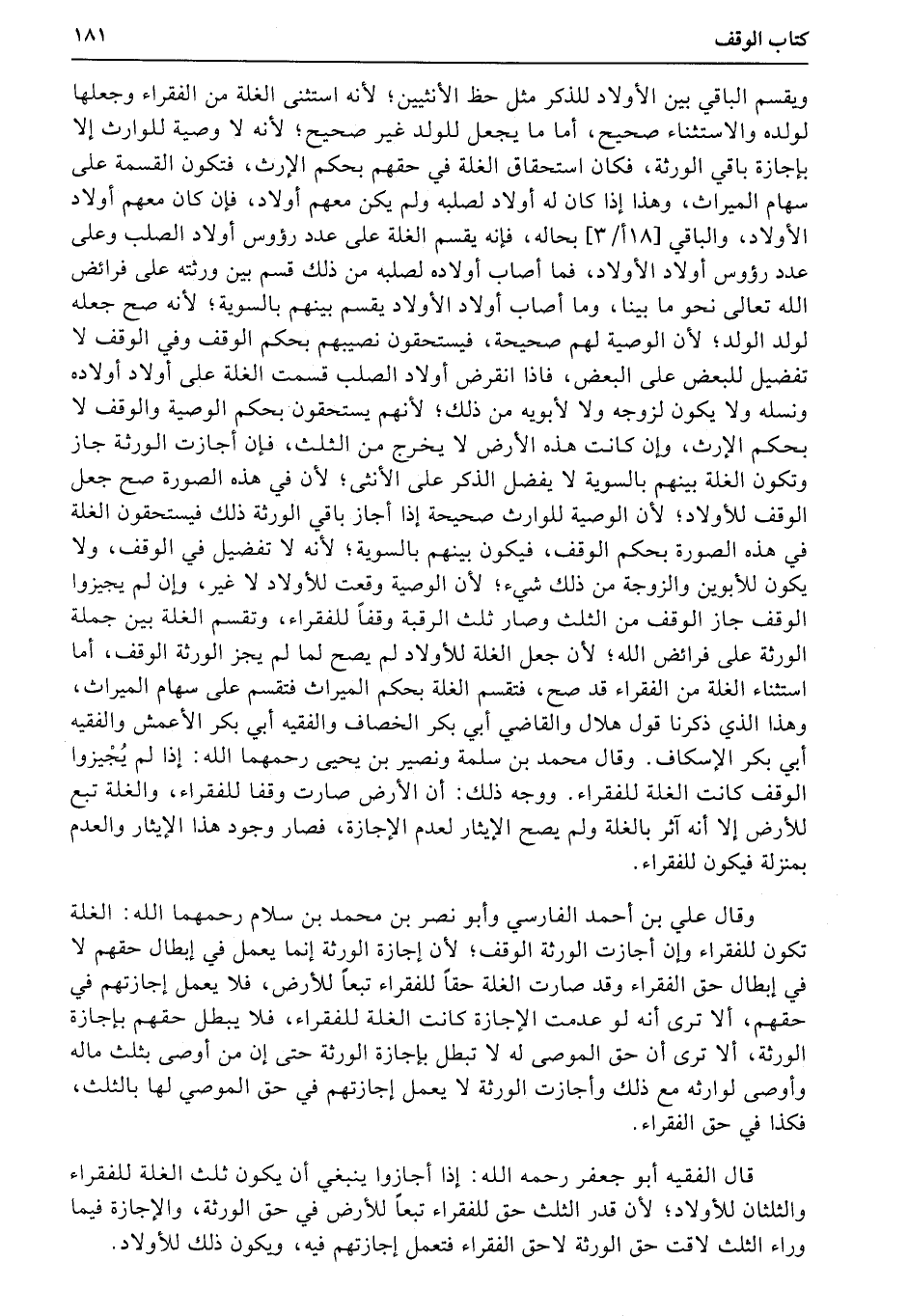 الوقف، أما استثناء الغلة من الفقراء قد صح، فتقسم الغلة بحكم الميراث فتقسم على سهام الميراث، وهذا الذي ذكرنا قول هلال والقاضي أبي بكر الخصاف والفقيه أبي بكر الاعمش والفقيه أبي بكر الإسكاف. وقال محمد بن سلمة ونصير بن يحيى رحمهما الله: إذا لم يُجْيزوا الوقف كانت الغلة للفقراء. ووجه ذلك: أن الأرض صارت وقفا للفقراء، والغلة تبع للأرض إلا أنه آثر بالغلة ولم يصح الإيثار لعدم الإجازة، فصار وجود هذا الإيثار والعدم بمنزلة فيكون للفقراء.
